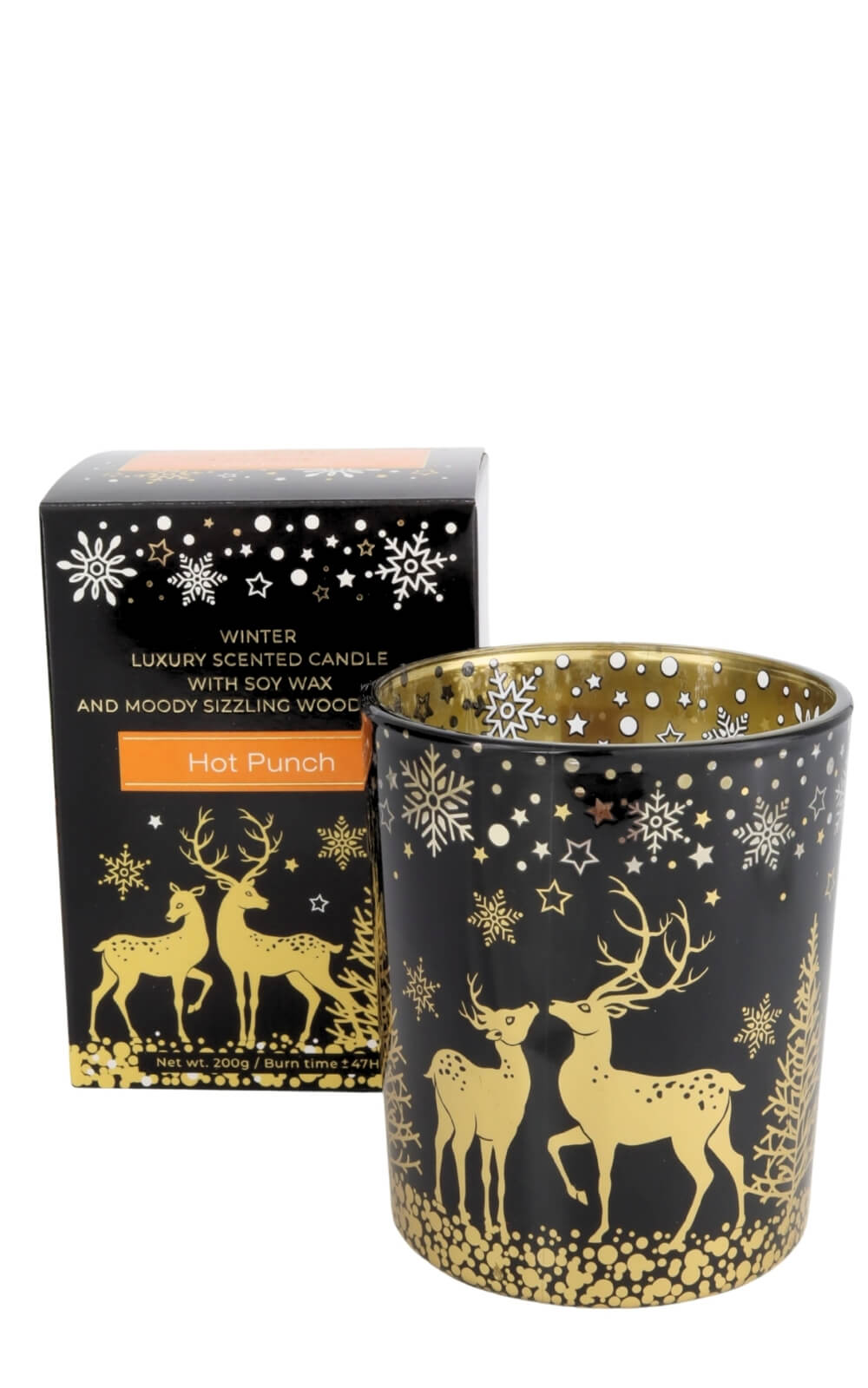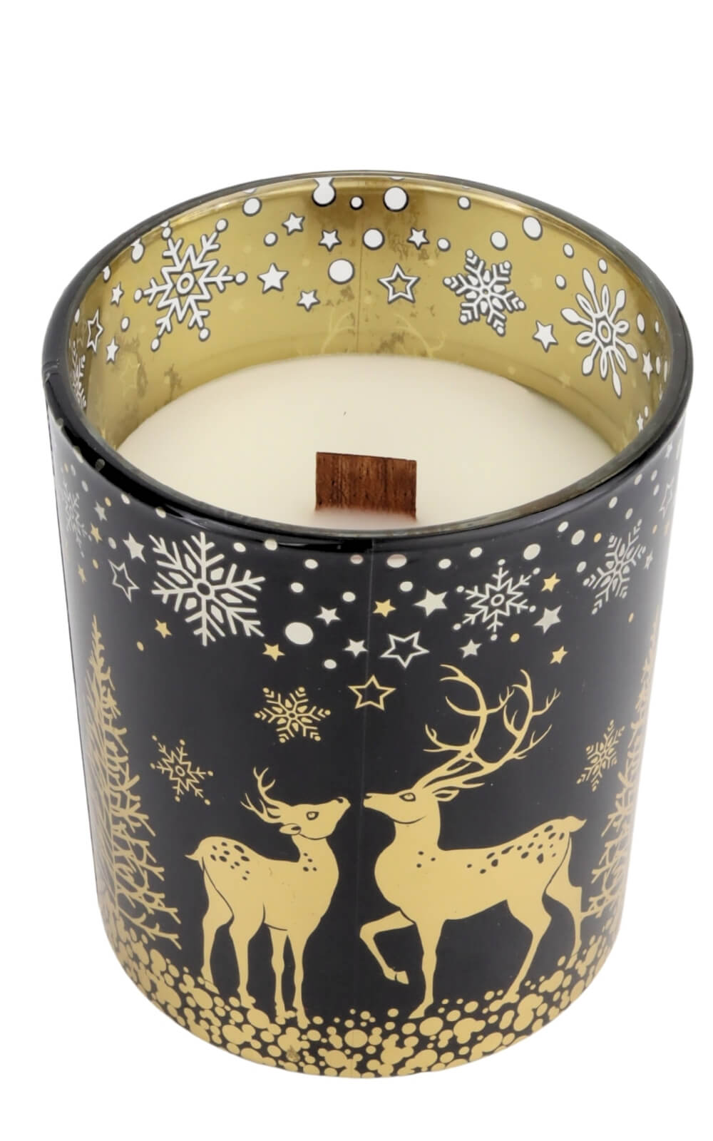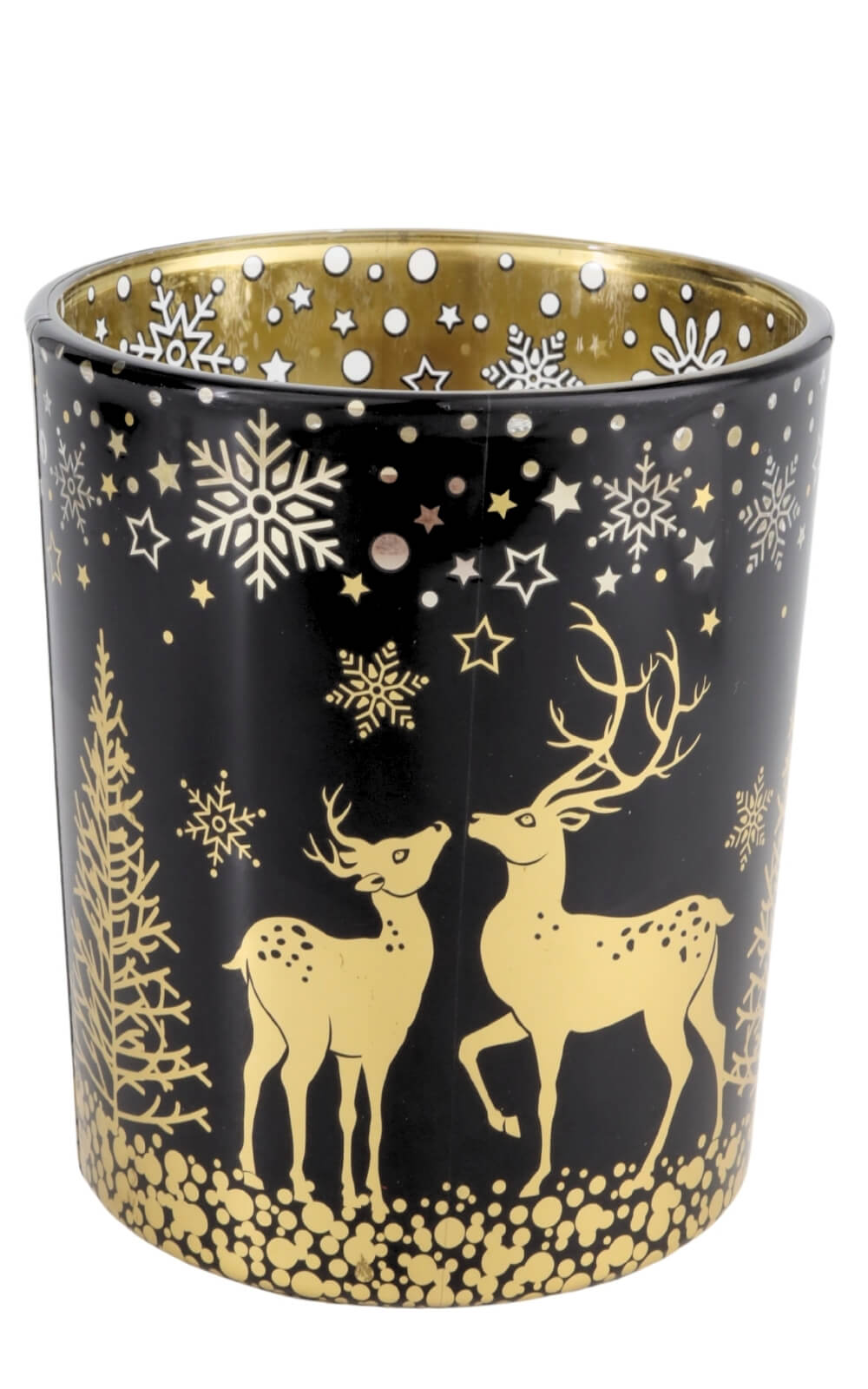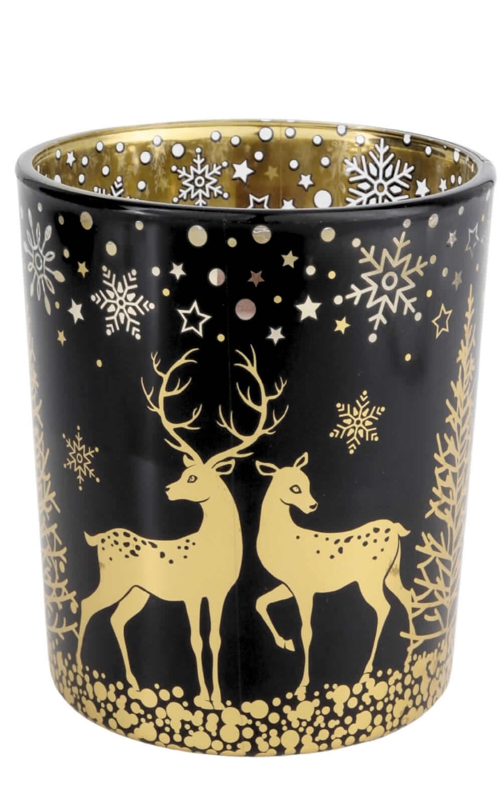 Im Mittelpunkt steht das Glasgefäß – modern, rund und von edler Schlichtheit. Außen zeigt es eine stimmungsvolle Winterlandschaft in tiefen Farbtönen, durchzogen von goldenen Sternen, schneebedeckten Tannen und zwei zarten Rehen. Die Szene wirkt wie gemalt und entfaltet ihren Zauber, sobald das Licht der Flamme hindurchschimmert. Innen schimmert das Glas in warmem Gold, das die Flamme sanft widerspiegelt und die Umgebung in weiches Licht taucht.