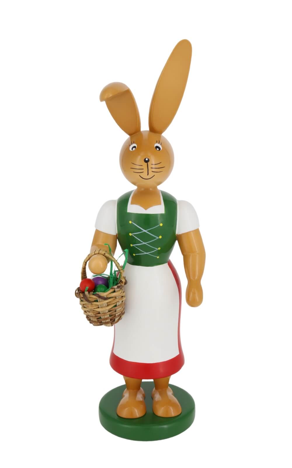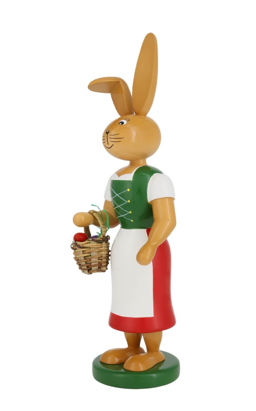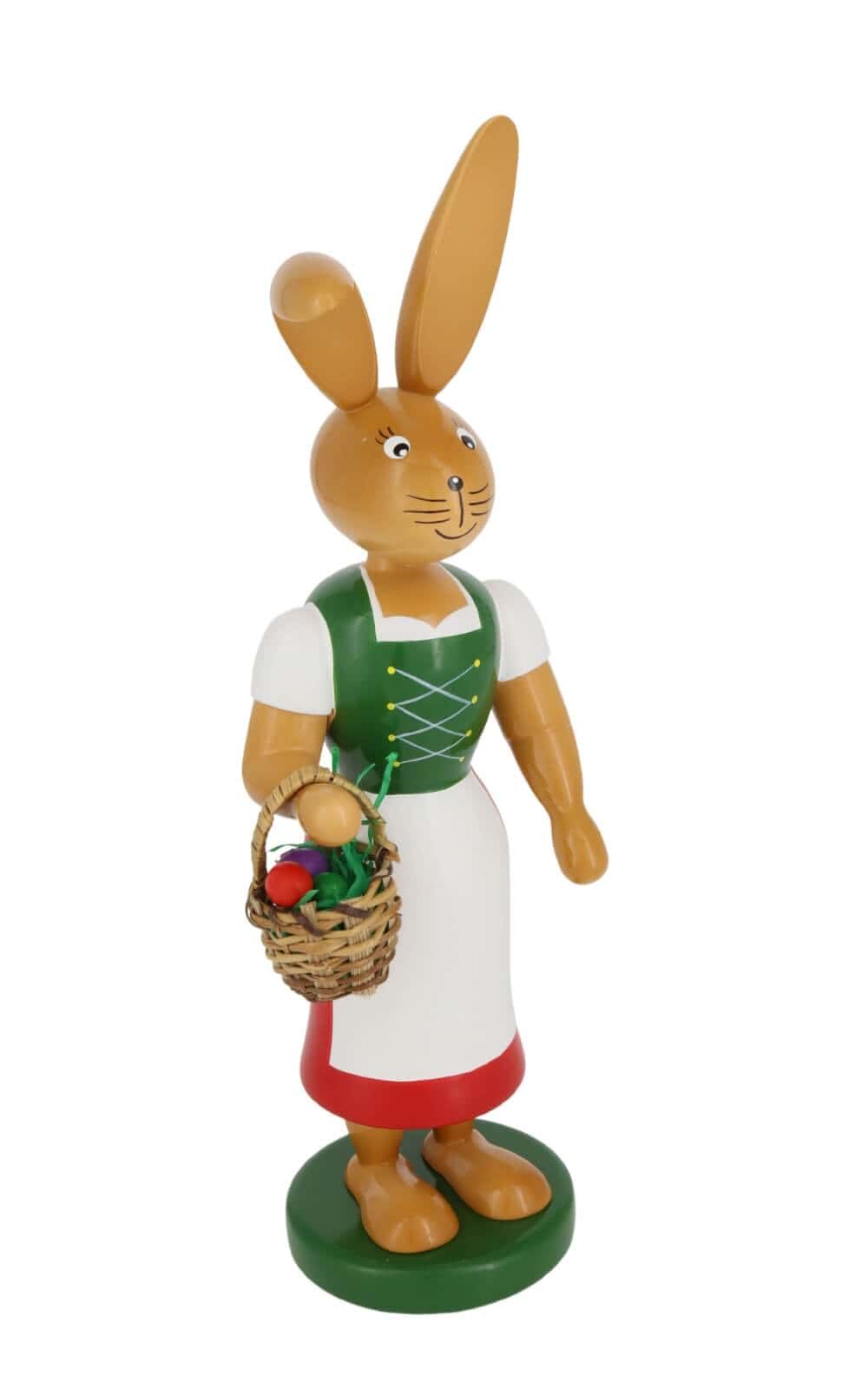 Whether as an Easter decoration or spring decoration - this bunny gives every interior a special charm. The colorful design harmonizes with most interior styles. The Easter bunny woman has colorful eggs in her basket, which are hidden in the meadow for Easter. Dressed in a white blouse and bodice and a long red skirt with a white apron, she makes her way to her bunny children.