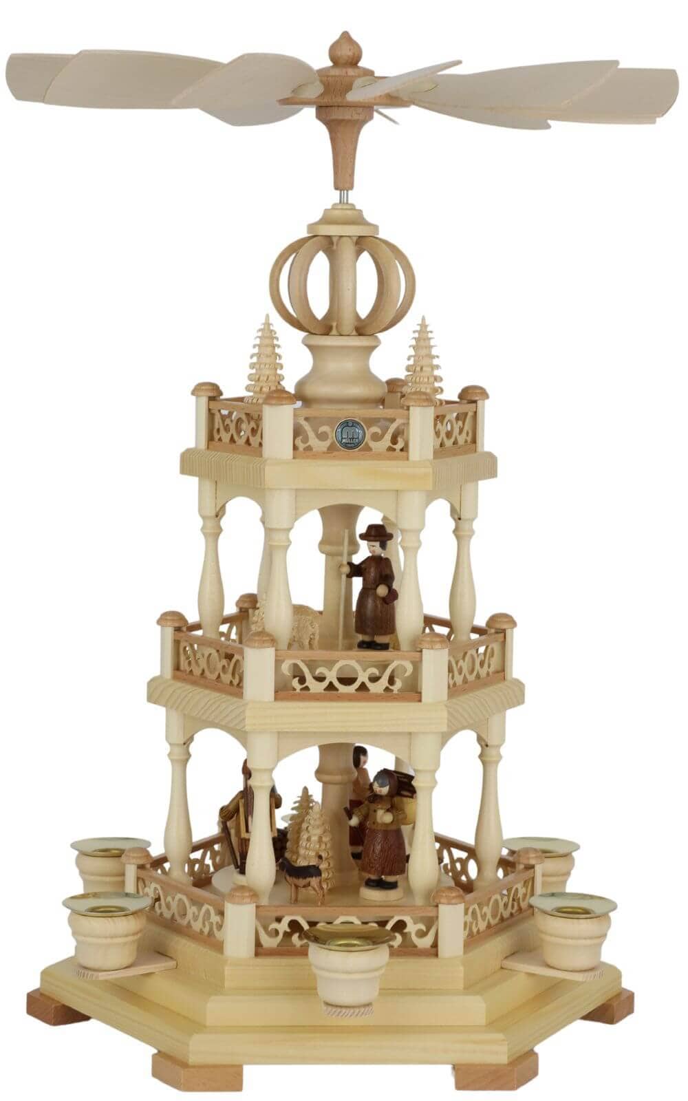 Six brass candle holders surround the octagonal base, designed for pyramid candles with a diameter of 14 mm. Once the candles are lit, the rising heat sets the fan wheel into gentle motion. The tiers begin to rotate quietly, the figurines circle slowly, and the candlelight reflects softly off the brass. This classic, electricity-free mechanism is reliable and creates the warm glow that defines the Advent season.