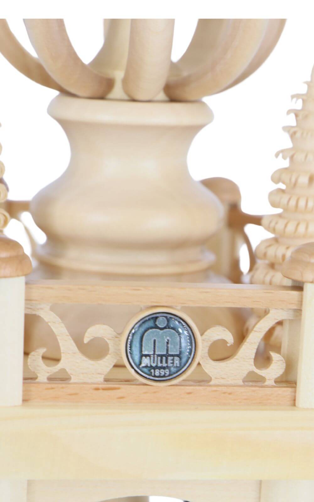 The Christmas Pyramid Forest Scene, 45 cm by Müller Kleinkunst, presents a lively woodland scene spread across three tiers. The natural tones of local woods – maple, beech, alder, ash, spruce, linden, and pine – shape its warm appearance. Elegant railings with curved details frame each level, turned wooden columns support the open structure, and the central spindle is topped with a decorative crown. Above, a large, lightweight fan wheel completes the pyramid. The embedded Müller emblem with the year 1899 emphasizes its authentic origin in traditional Ore Mountain woodcraft.