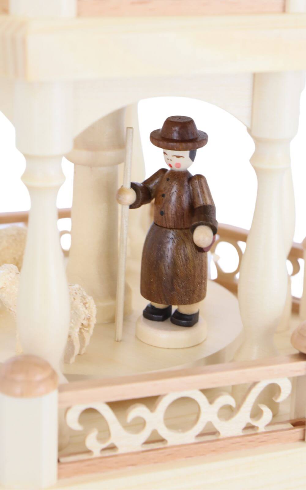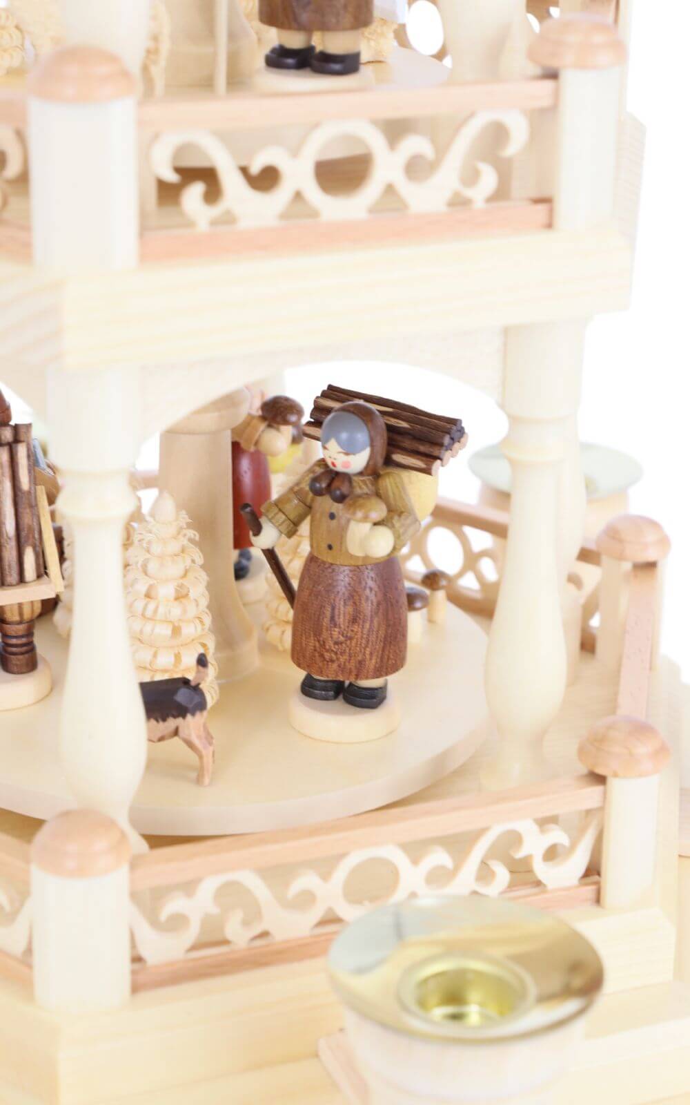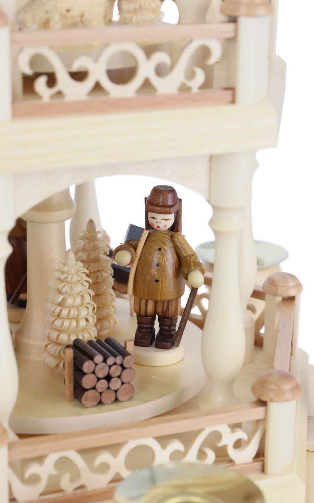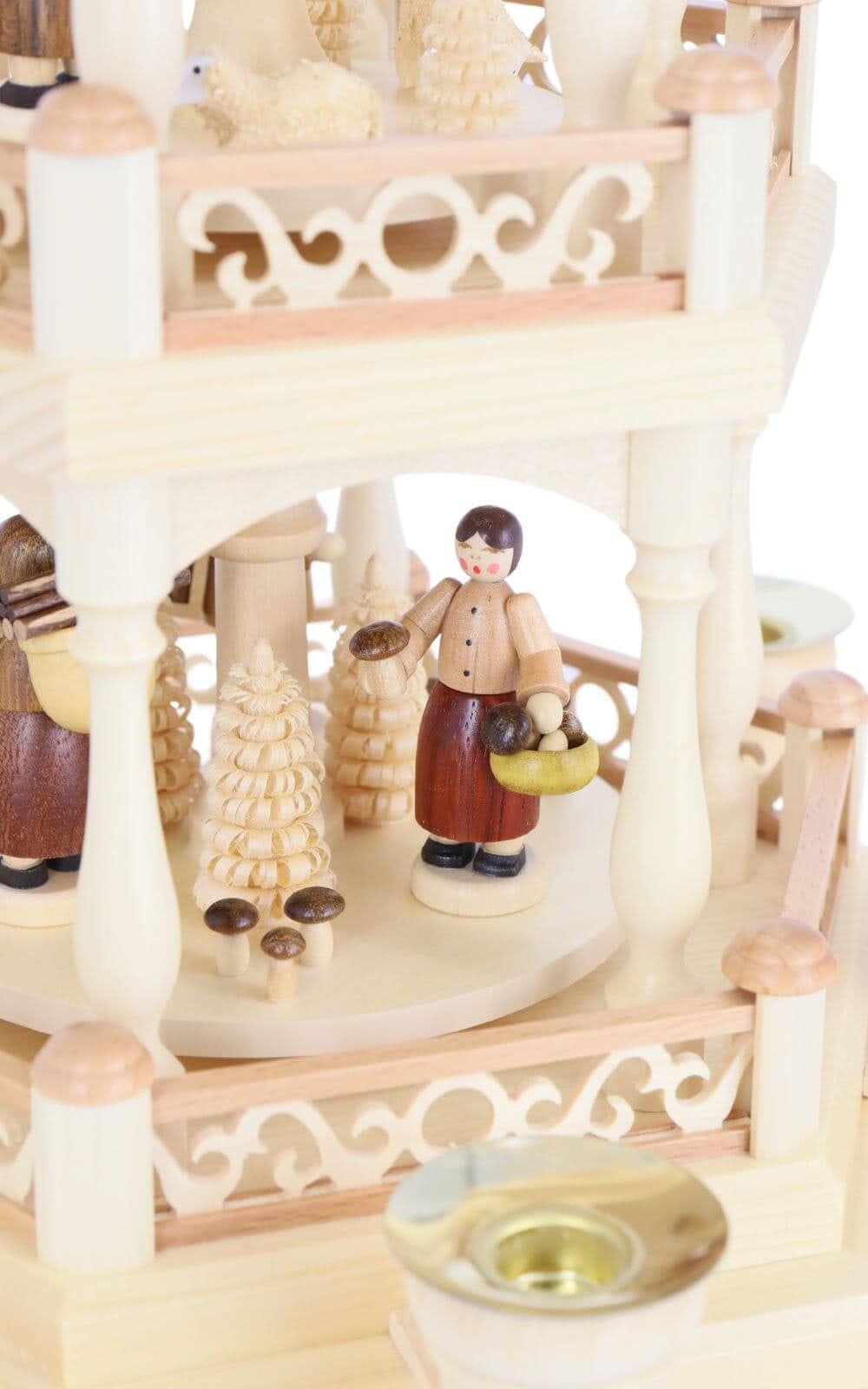 On the lower rotating platforms, carefully hand-painted figurines tell their story: a woodcutter with an axe, a gatherer with a basket of mushrooms, a carrier with logs, and a shepherd with his staff. Small carved trees in different sizes, mushrooms, and even a dog complete the woodland setting. Each figurine is placed thoughtfully, so as the pyramid turns, it creates a calm, storytelling rhythm – like a winter walk through the forest.