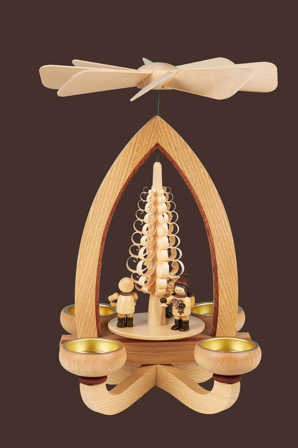 Made from materials such as maple, beech, alder, ash, spruce, lime and pine, the pyramid is characterized by its durability and natural finish. The classic design emphasizes the quality craftsmanship and artistic detail of the Striezelkinder, which makes each pyramid unique.