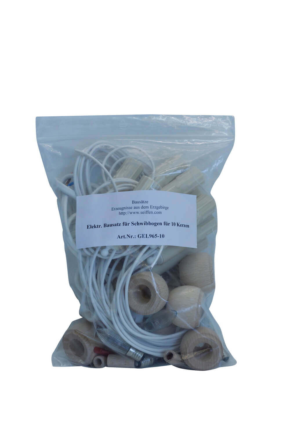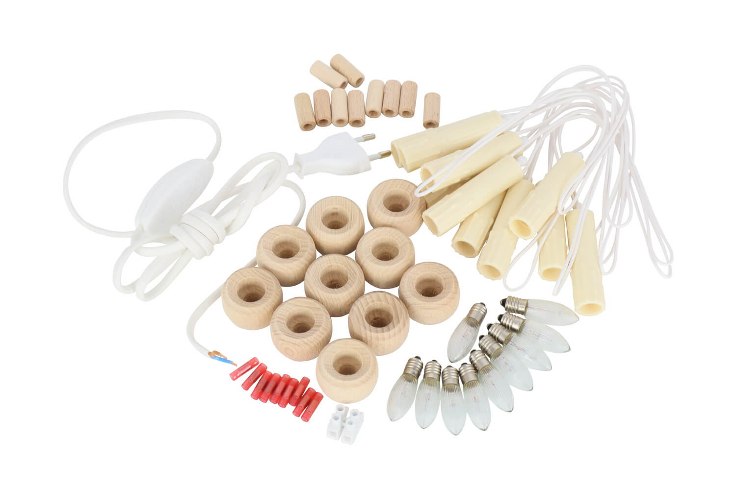 Kit for 10 candle arch, 10 corrugated candles 23 volt, 1 connecting lead with switch, 1 luster terminal, 10 candle sleeves completely assembled with 26 cm long leads, 9 crimp connectors, 10 wooden grommets with respective connecting sleeve