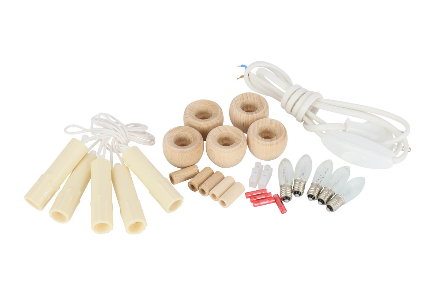 Kit for 5 candle arch, 5 corrugated candles 46 Volt, 1 connecting cable with switch, 1 luster terminal, 5 candle sleeves completely assembled with 26 cm long cables, 4 crimp connectors, 5 wooden grommets with respective connecting sleeve