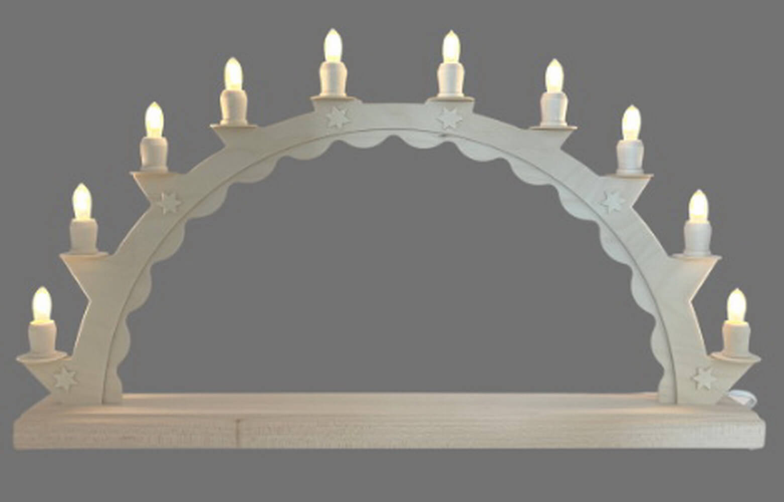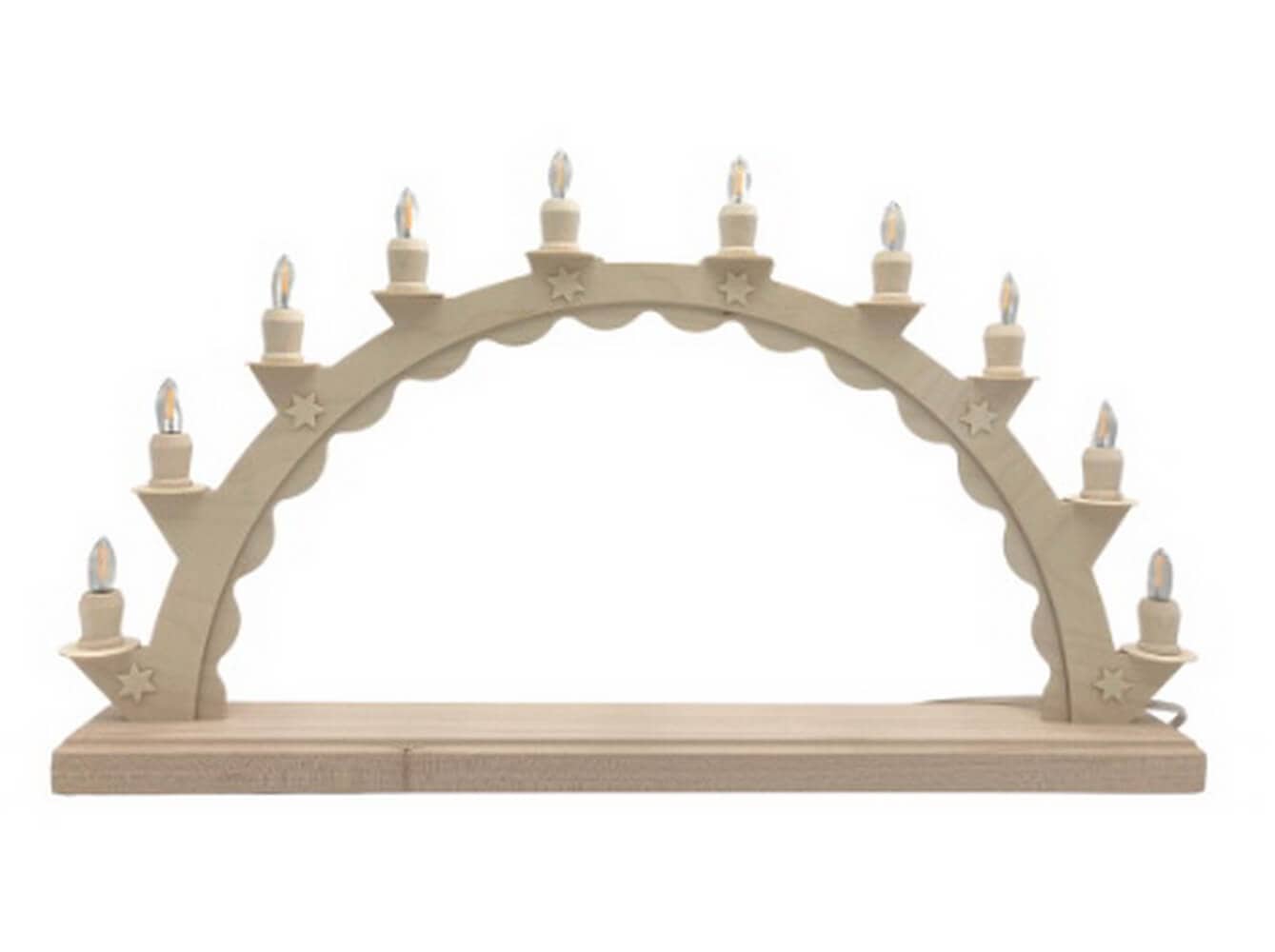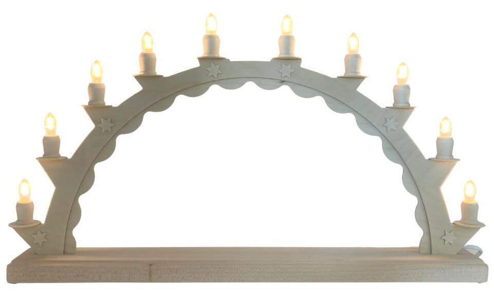 This handmade from the spa town of Seiffen in the Ore Mountains is a real "Made in Germany" product and at the same time an original from SEIFFEN.COM by Nestler. The LED candle arch is electrically illuminated and impresses with its 10 warm white LED fluted candles. These create a pleasant, warm light, that bathes any room in a cozy atmosphere. As an empty arch, this candle arch offers a lot of design possibilities. Put your individual miniature collection under the arch in the right light.