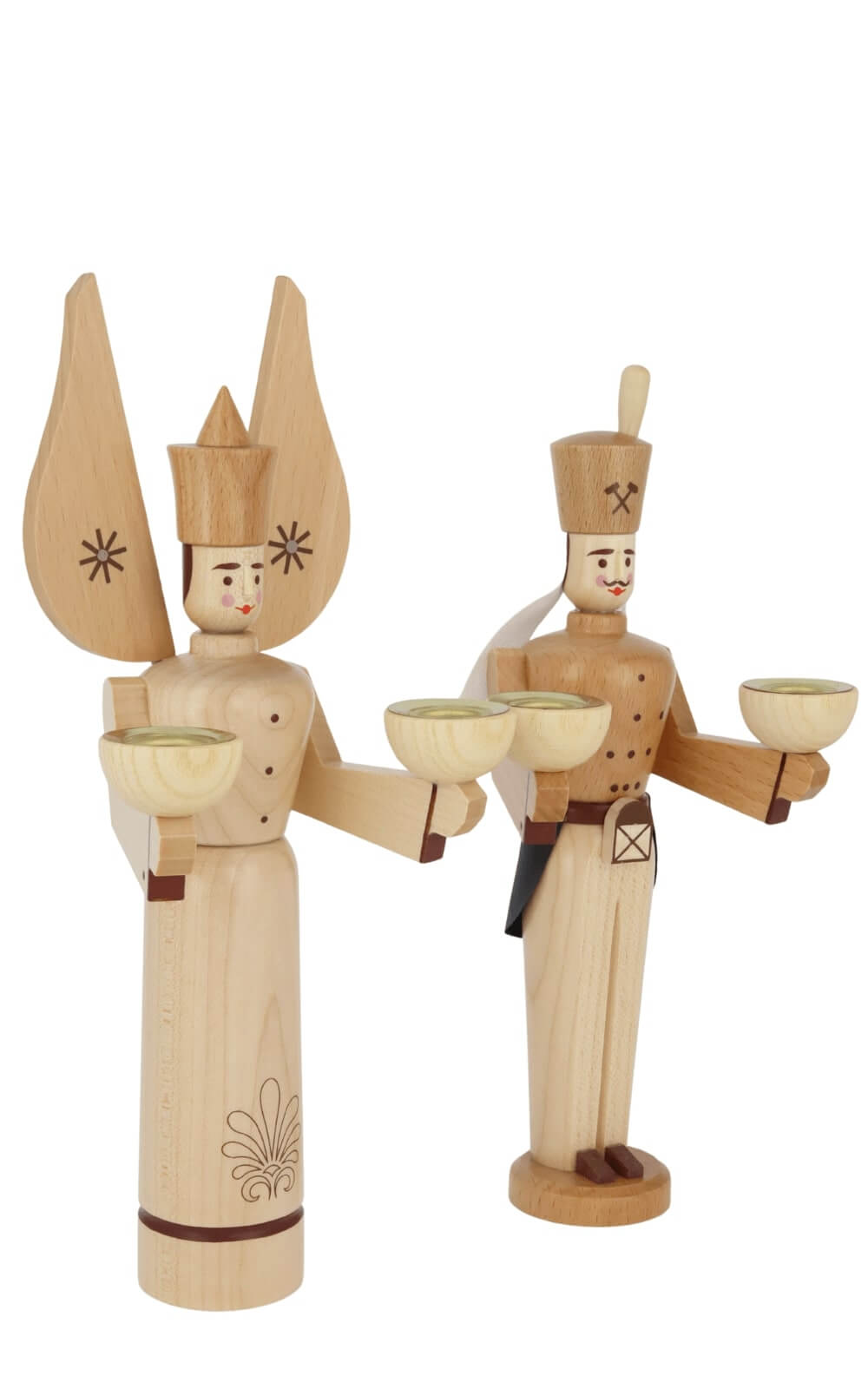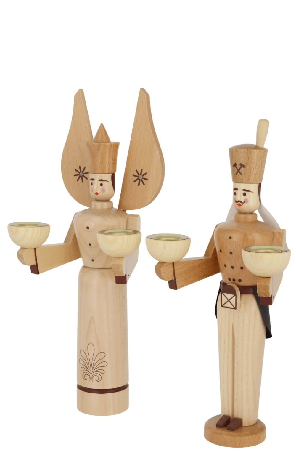 A special feature of the angel and miner figurines from the Eckert Volkskunstwerkstatt is the option, to light them with pyramid candles. Each figure can be fitted with two candles, which spread a warm, inviting light and thus create an incomparable atmosphere during the Advent season. This lighting concept not only brings the figures to life, but also emphasizes the artistic craftsmanship, that goes into every detail.