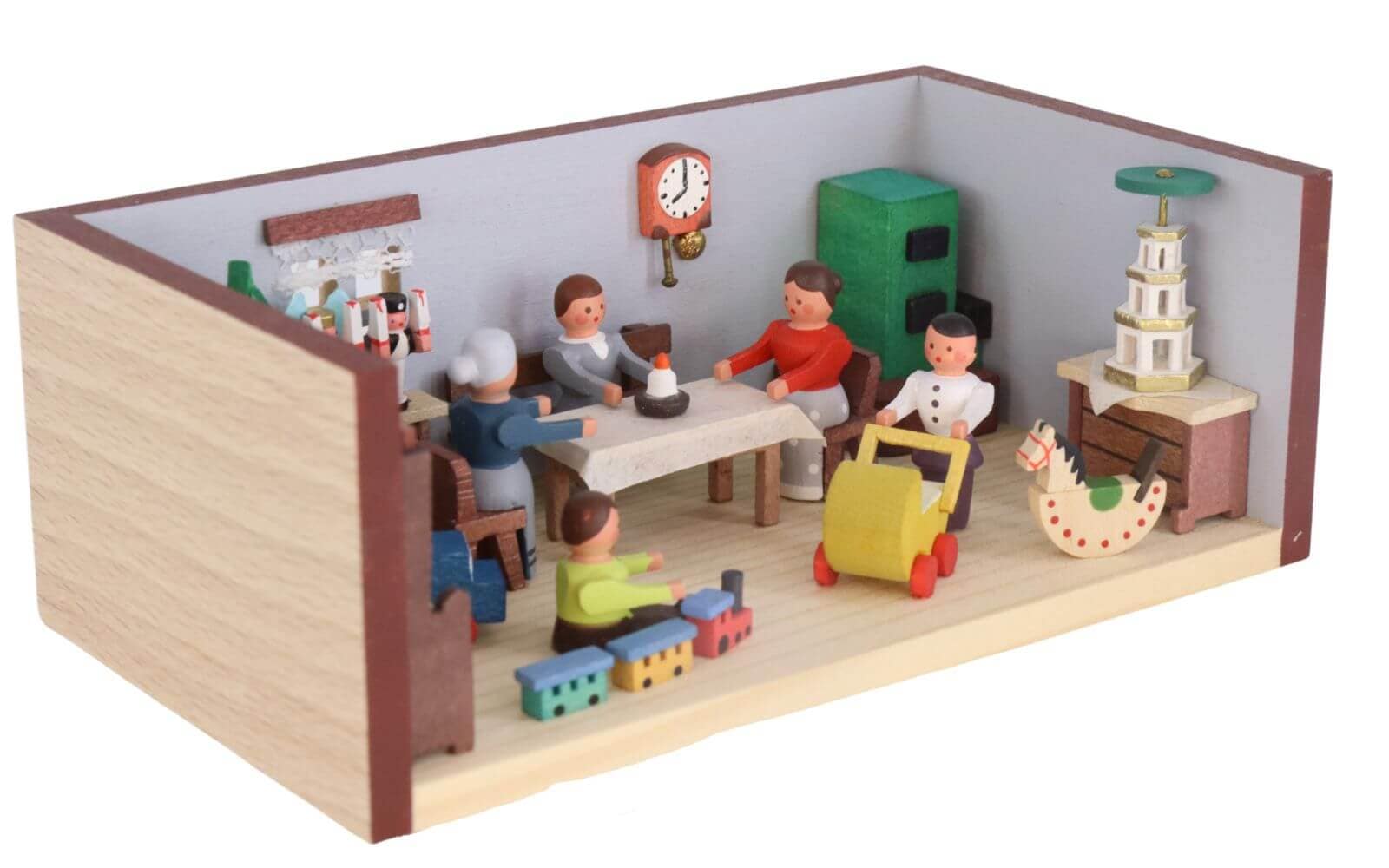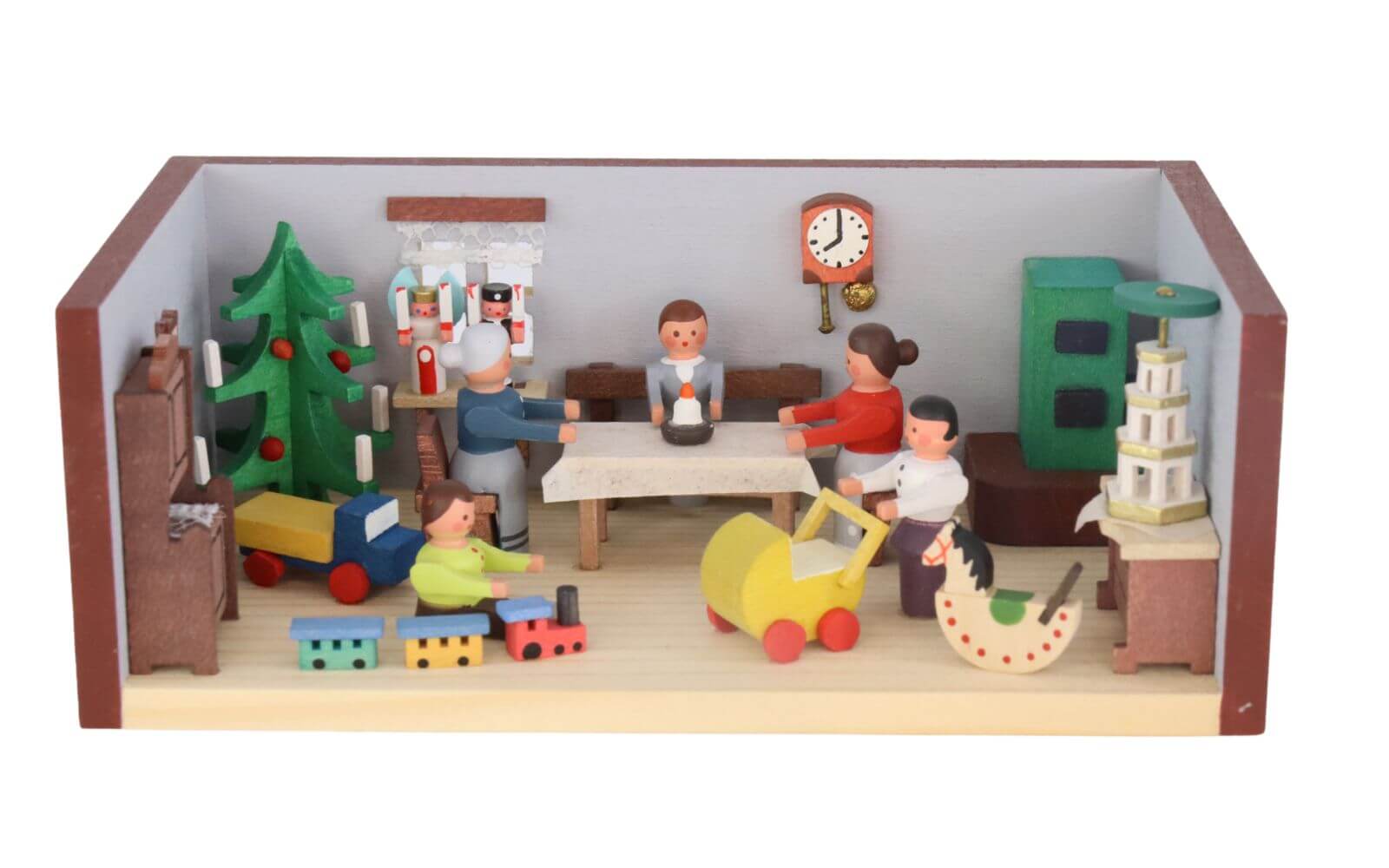 The small Christmas tree and the lovingly designed toys create an atmospheric Christmas scene, which invites you to dream. A typical Erzgebirge Christmas is celebrated with genuine Erzgebirge folk art. The rooms are festively decorated. Just like in this parlor, angels and miners stand in the windows, a Christmas pyramid turns while soft Advent music plays and a cozy fire blazes in the tiled stove. The Christmas parlor is inhabited by several generations. The grandma and the mother have baked a cake, which is already awaited with great appetite. The children are happily playing with truck, train, rocking horse and doll carriage. The Christmas scenery looks harmonious and peaceful.