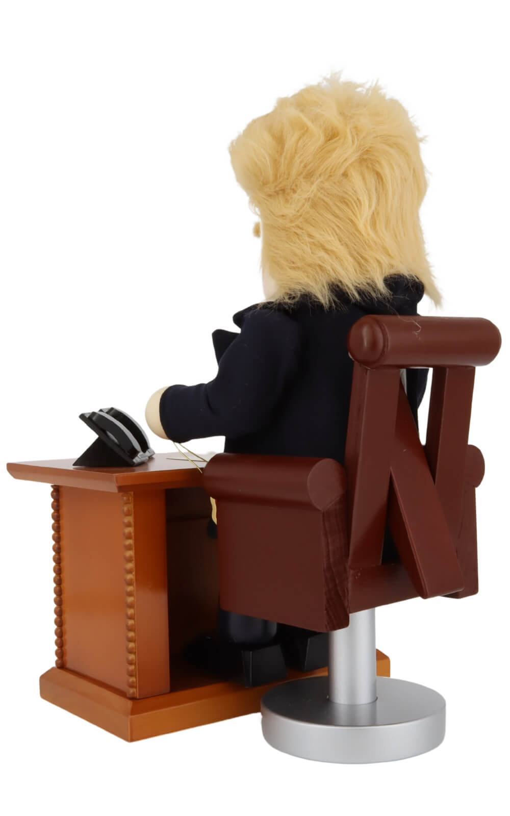 Expertly handcrafted in Marienberg in the Ore Mountains, the Nutcracker President at the Desk in the Oval Office of the White House captures a playful yet refined scene. The figure wears a classic black suit with a red tie and holds a golden pen, poised to sign official documents. The famous “Resolute Desk” is recreated in detailed miniature form, complete with two phones, an official-looking plaque, and a charming red figure holding an American flag. The presidential seal labeled “Resolute Desk of the President” adds an authentic finishing touch and perhaps the nutcracker The Resolute Desk of the President - A Piece of History is somewhat reminiscent of the 45th and 47th President of the United States, Donald Trump.