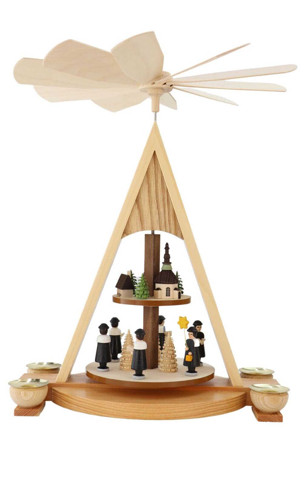 The motif "Kurrende and Seiffen village" evokes the cozy atmosphere of the Erzgebirge village during Advent. It shows the classic Kurrende singers, who traditionally sing in the Erzgebirge towns and villages at Advent- and Christmas. They are arranged on the lower turntable. Above them turns the Seiffenr dorf with its famous baroque church, which is considered the symbol of the Erzgebirge Christmas.