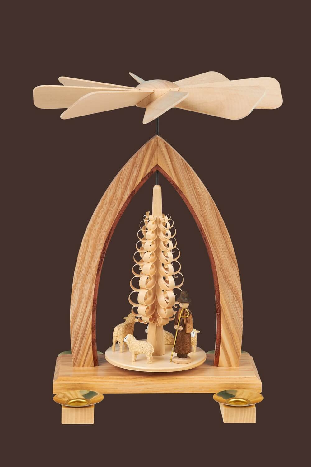 The classic design of the Christmas pyramid with shepherd and sheep embodies the simple elegance of traditional craftsmanship. The pyramid is made from various native woods such as maple, beech, alder, ash, spruce, lime, and pine. These high-quality materials ensure durability and stability while giving the pyramid its warm, natural tone. The natural color scheme aligns with the traditional craftsmanship of the Ore Mountains, emphasizing the attention to detail in each pyramid. Each piece is handcrafted, making every pyramid a unique item. The wax candles, perfectly matched with a 14 mm diameter, power the fan blades through rising heat, creating a charming rotating scene.