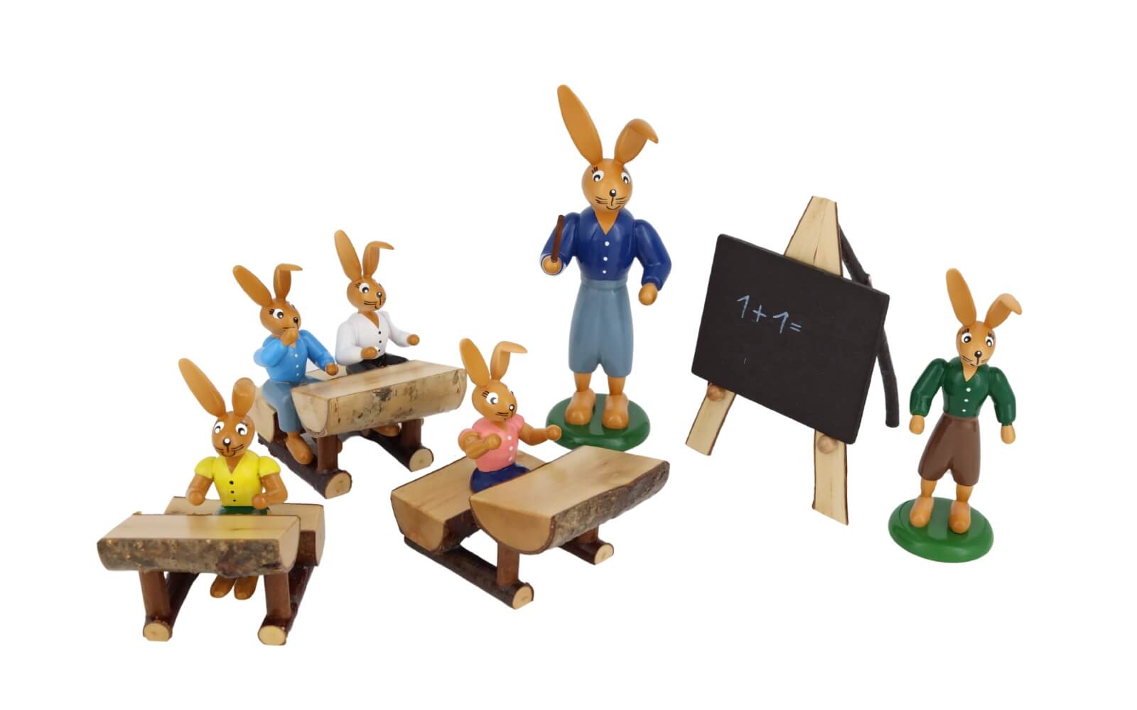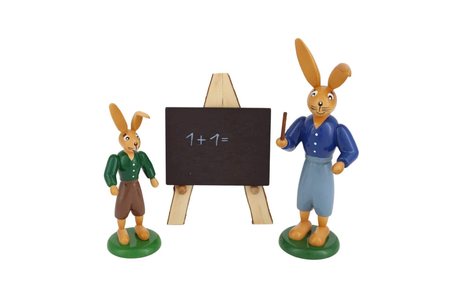 Bunny schools are a popular motif at Easter time. Must nevertheless the hare children the multiplication tables of the egg painting and egg hiding first learn. In addition also the arithmetic, because one should know as Easter hare already, how many Easter eggs in the gardens must be hidden. The Hare school from the manufacture of wood art Gahlenz visit at present 5 hare children. All Easter hares unite an important detail - the Knickohren. By it one recognizes immediately the Easter hares by Gahlenz.