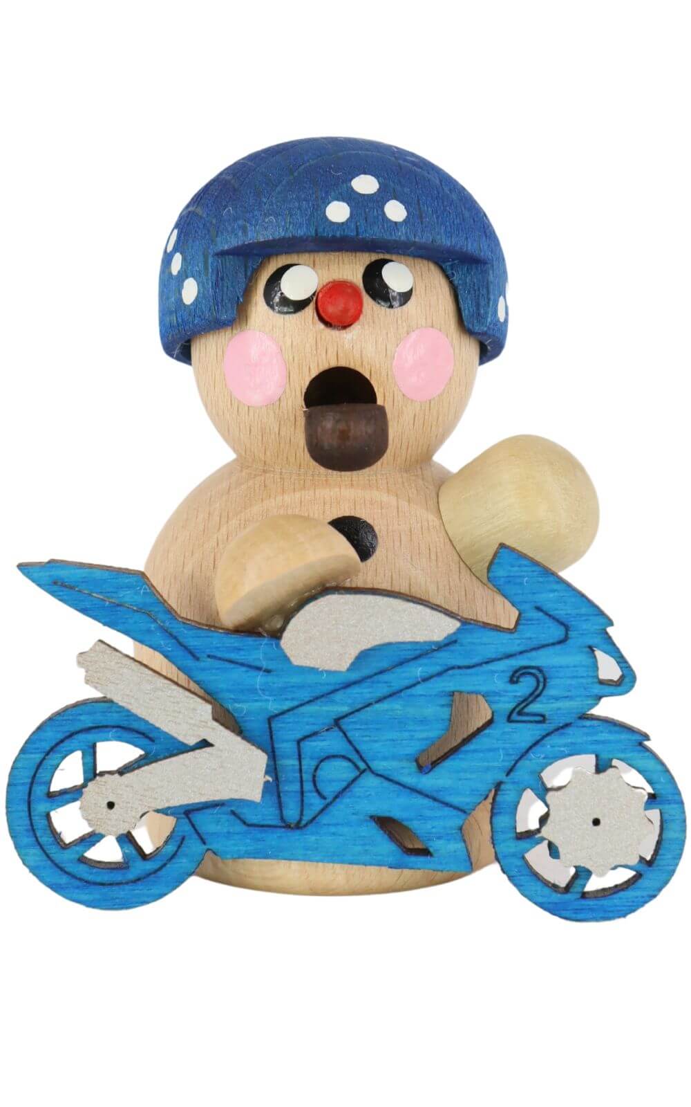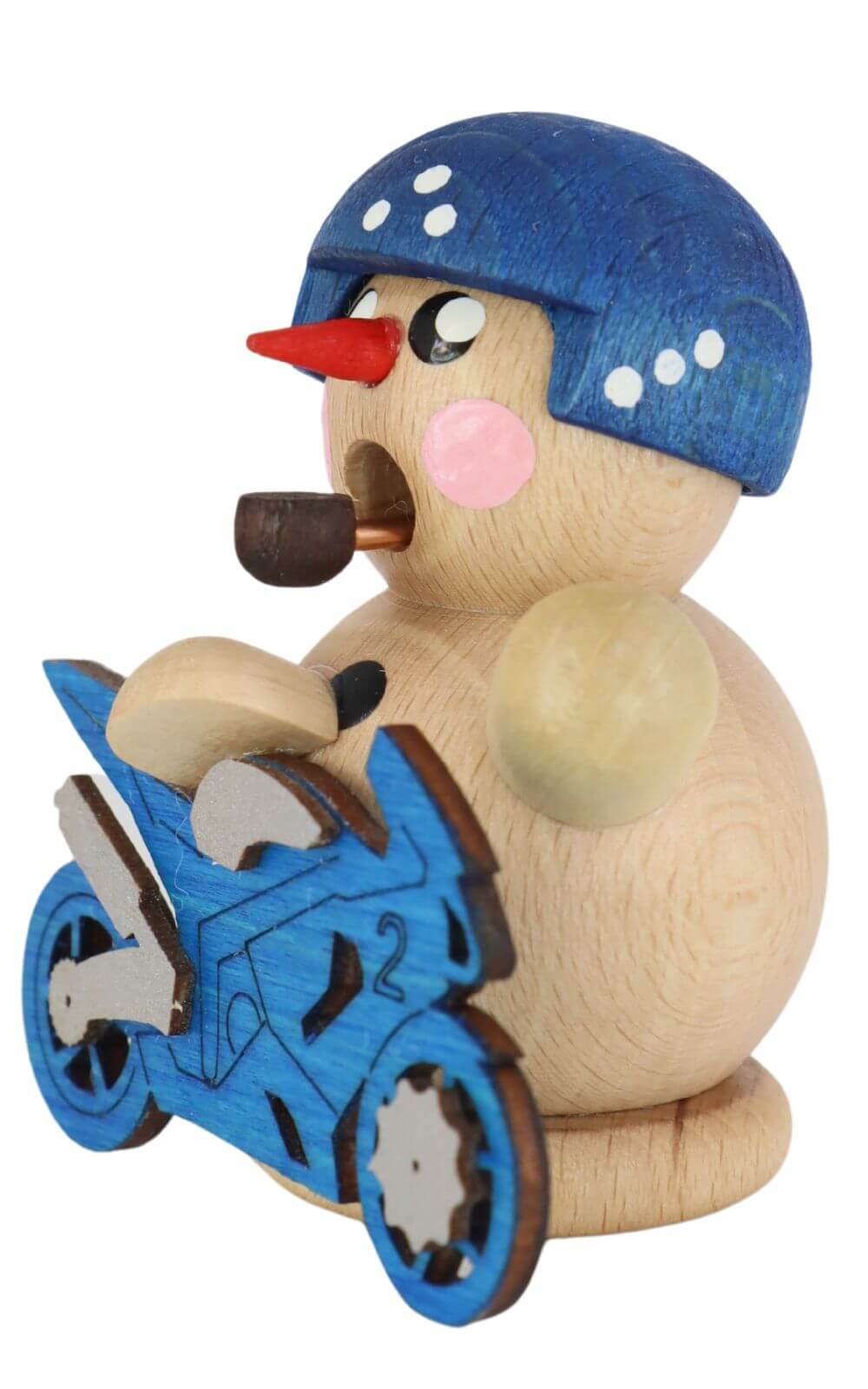 The Incense Figure Biker Natural with Blue Motorcycle by Gerd Hofmann is an impressive example of modern craftsmanship from the spa town of Seiffen in the Erzgebirge. Made from local woods such as maple, beech, and spruce, this figure combines traditional techniques with a contemporary design. The natural color of the biker and the striking blue motorcycle give the figure a unique and stylish look. Each piece is lovingly handcrafted, ensuring top-quality “Made in Germany.”