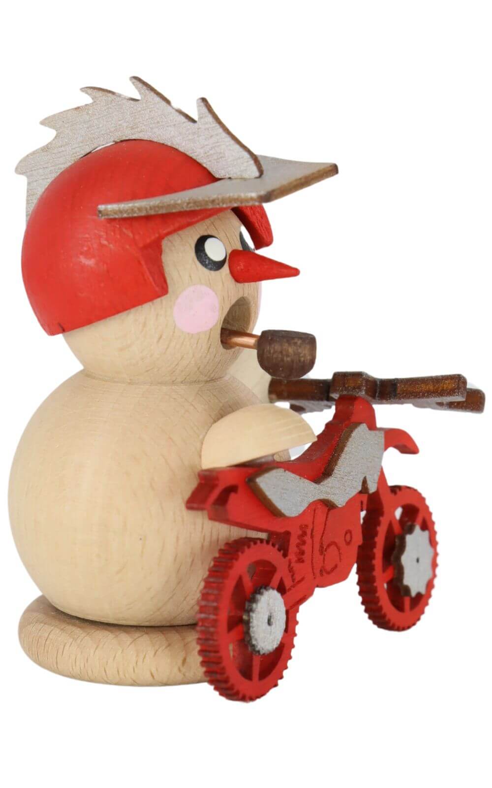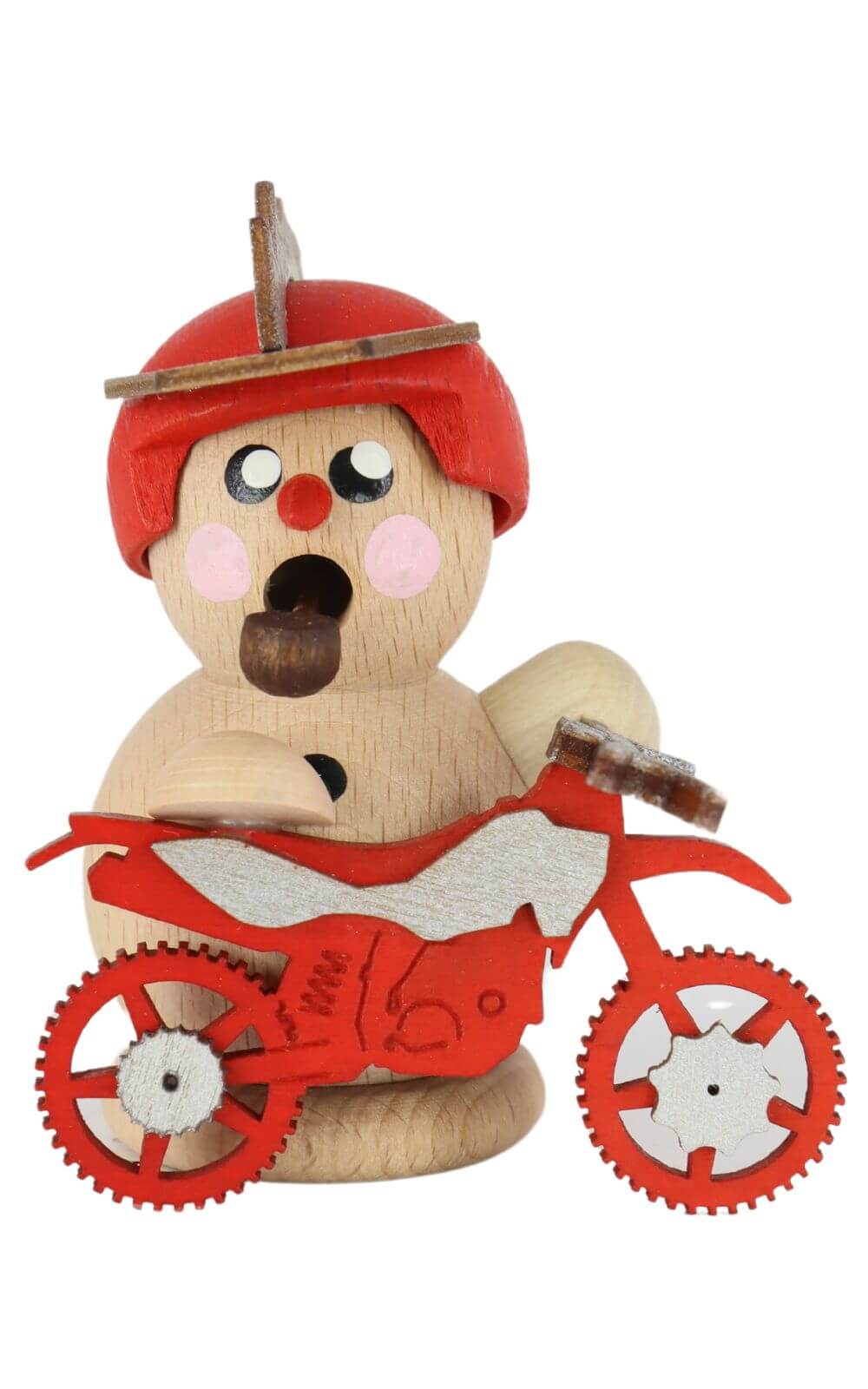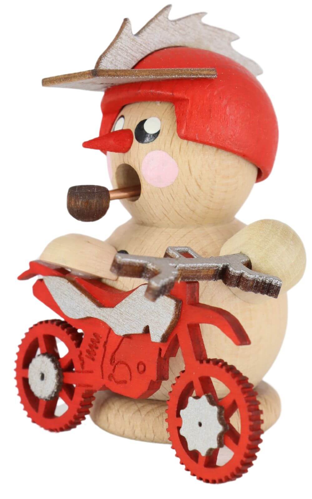 The spa town of Seiffen in the Ore Mountains has been known for its handmade wooden figures and smoker figurines for generations. Gerd Hofmann continues this tradition with modern interpretations, striking a balance between classic craftsmanship and contemporary design. The biker smoker, seated on a bright red cross motorcycle, captures the spirit of adventure and brings vibrancy and dynamism to any setting.
