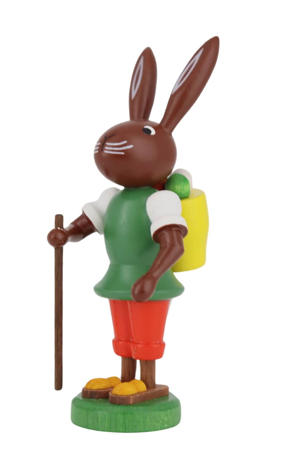 The Easter bunny with basket is a symbol of the joy and surprise, that Easter brings to people's hearts. Skilfully painted and varnished with attention to detail, he appears in a green and white top and red trousers, which gives him a cheerful, spring-like appearance. In his yellow basket, carried safely on his back, there are many colorful Easter eggs, waiting to be distributed. Equipped with a walking stick, this Easter bunny is ready, to tread uneven paths and overcome small and large obstacles, to bring the colorful Easter eggs safely to their destination.