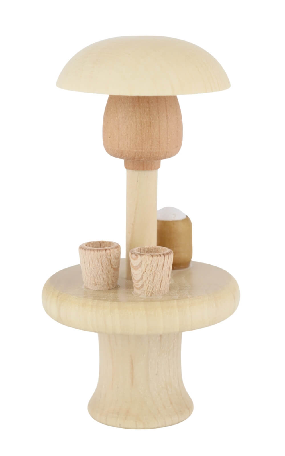 This unique miniature figurine shows a mushroom-shaped shelter protecting a small round table, complete with tiny wooden mugs and cups. The dimensions are 7 cm (2.75 in) high, 4 cm (1.57 in) wide, and 4 cm (1.57 in) deep. Compact in size yet rich in detail, the Wärmepilz with Table is perfect for shelves, mantels, or display cabinets. The visible wood grain and smooth finish highlight the natural material, while the playful mushroom form adds a rustic yet elegant touch. It is instantly recognizable as an authentic Ore Mountains (Erzgebirge) collectible.