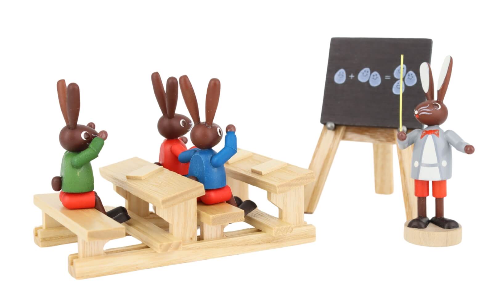 Mit der Hasenschule, kleine Klasse, von Stephan Kaden aus Seiffen können Sie einen kleinen Blick in das Klassenzimmer der Osterhasen werfen. Dort haben sich die jüngsten Hasenkinder versammelt, um zu Lernen, wie das Osterfest vorbereitet wird. Das fängt mit dem kleinen Einmaleins an, damit auch ja jedes Kind ein Osterei erhält. Erwischt! - da hat wohl das Häschen in der zweiten Reihe nicht aufgepasst, denn ganz erschrocken hebt es die Hände vor das Gesicht, als der Lehrer das Häschen fragt. In der ersten Bank sitzen zwei aufmerksamere Hasenschüler, einer meldet sich fleißig.
