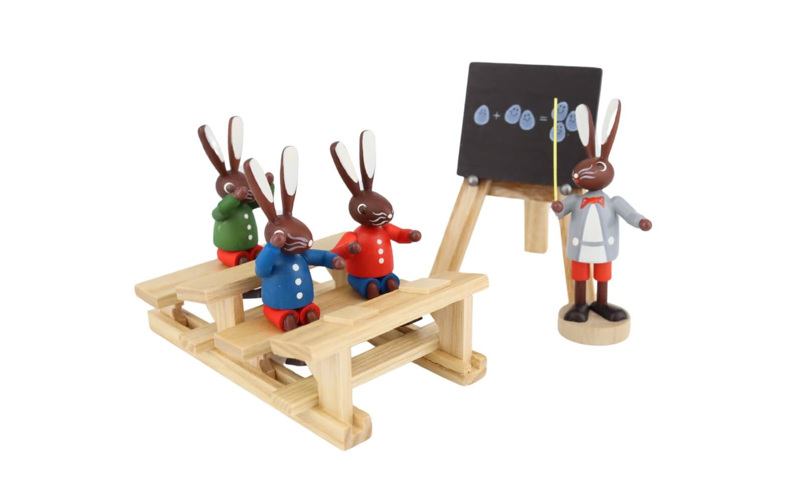 Osterhasenschule kleine Klasse (3 Hasenschüler, 1 Lehrer, 1 Bank (lang), 1 Tafel), farbig, 6 cm von Stephan Kaden holz.kunst aus Seiffen im Erzgebirge