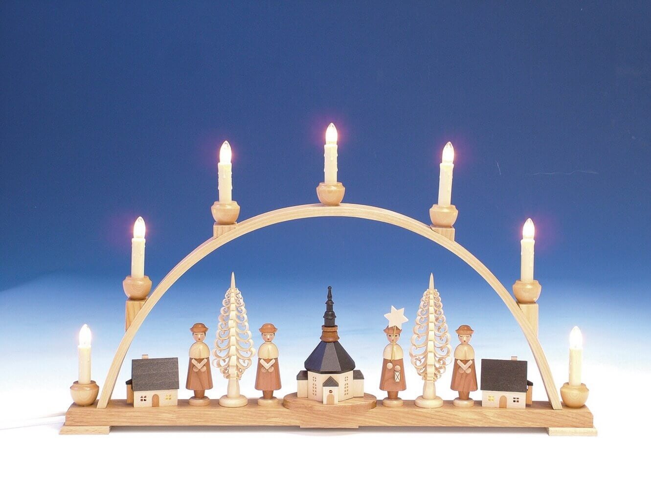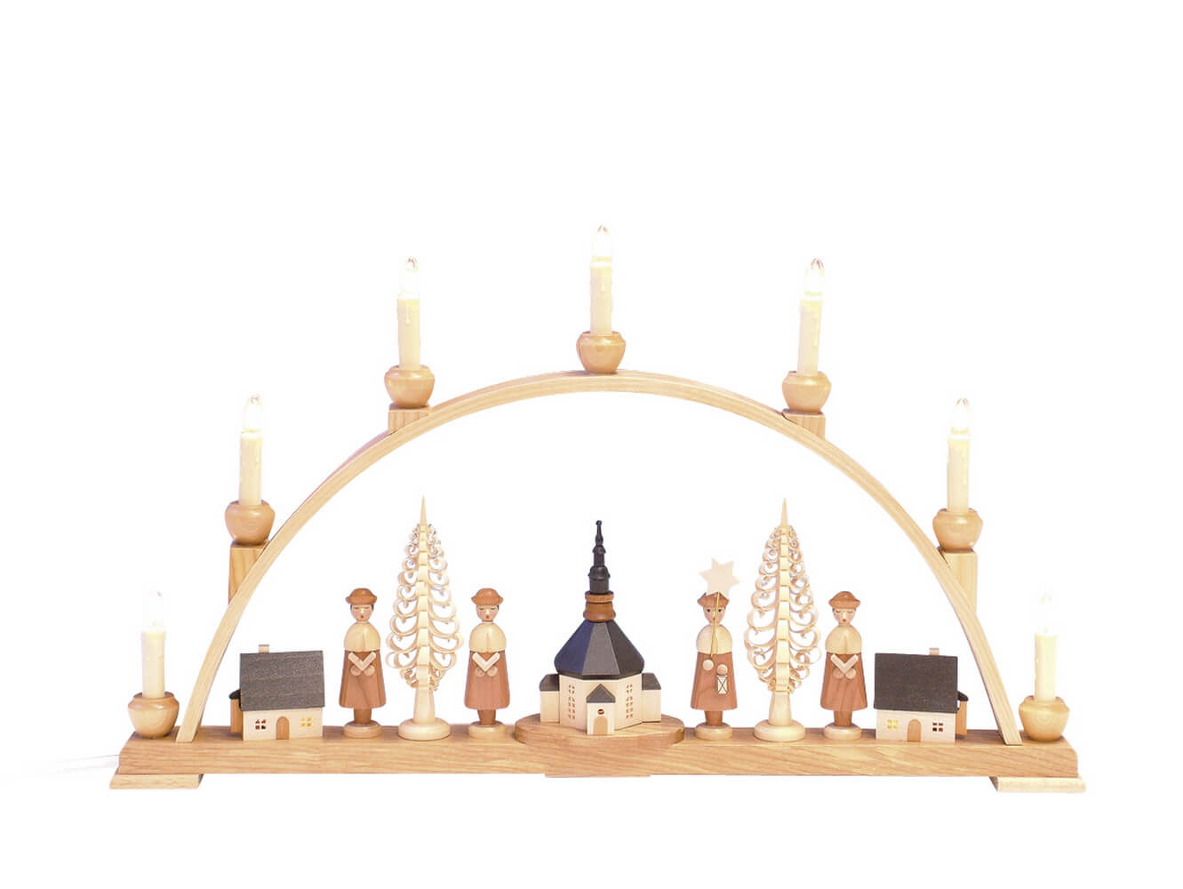 Schwibbogen mit Seiffener Kirche, natur, komplett elektrisch beleuchtet, 63 cm – Tradition und Handwerkskunst aus dem Erzgebirge