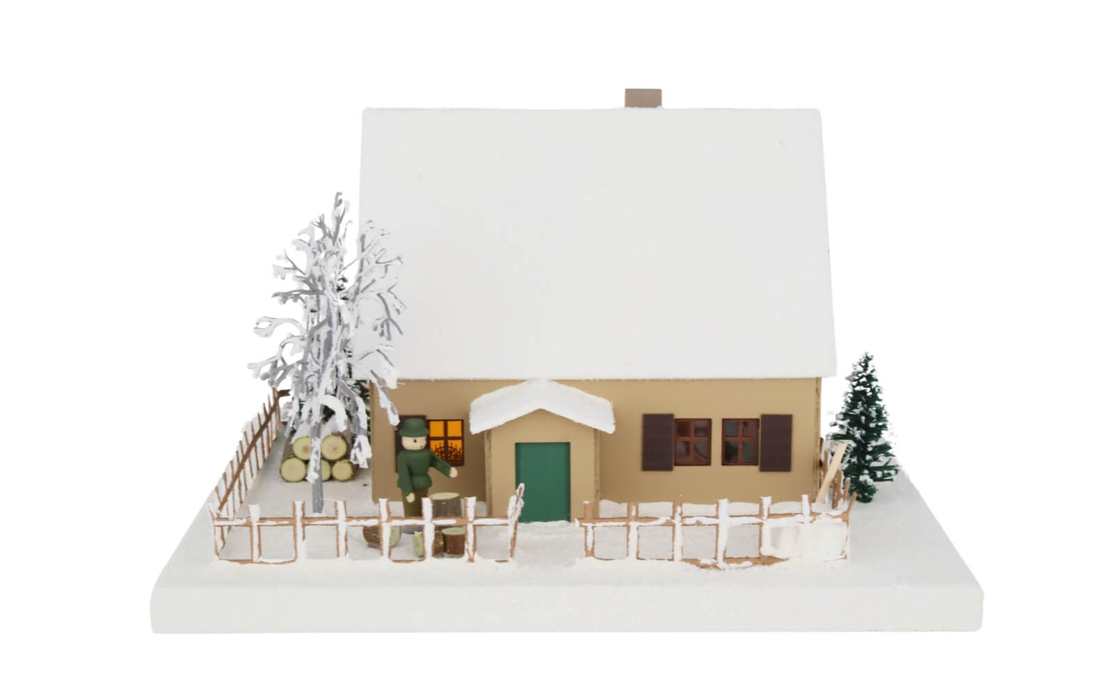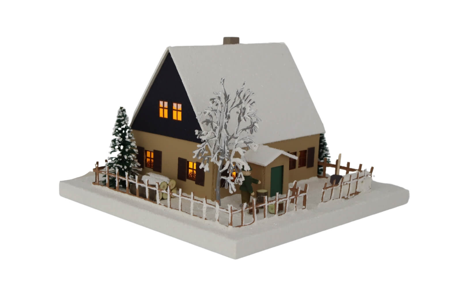 Mit seinem klassischen Design, dem verschneiten Dach, der detaillierten Umzäunung und der liebevollen Miniaturlandschaft samt Baum, Holzstapeln und Figur spiegelt das Lichterhaus Erzgebirgshaus mit Weihnachtsstube, klein, 12 cm von Birgit Uhlig die typischen Merkmale eines traditionellen erzgebirgischen Wohnhauses wider. Jedes Detail wurde sorgfältig aus Feinkarton gefertigt und kunstvoll bemalt.