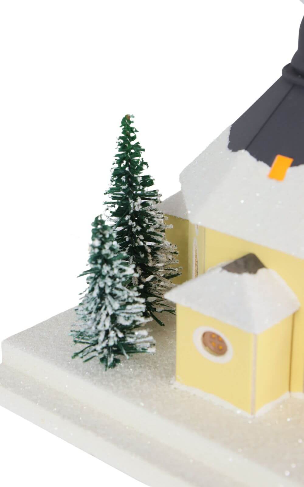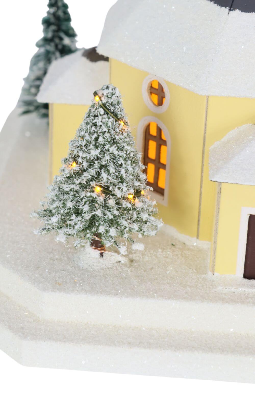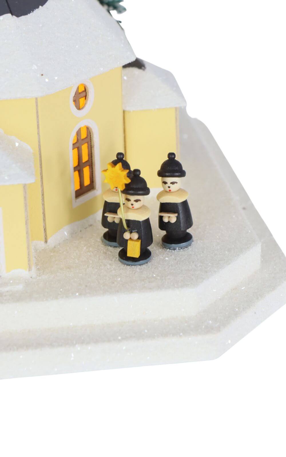 Das Lichterhaus stellt die Seiffener Kirche dar, in der heute der Weihnachtsgottesdienst stattfindet. Vor der Kirche steht ein mit einer Lichterkette geschmückter Weihnachtsbaum, umgeben von der Kurrende, die die Besucher des Gottesdienstes erwartet. Diese Szene ist mit viel Liebe zum Detail gestaltet und farbig bemalt. Das Lichterhaus besteht aus Feinkarton, während Fenster und Türen aus Pergamentpapier gefertigt sind, was eine warme und einladende Beleuchtung ermöglicht.