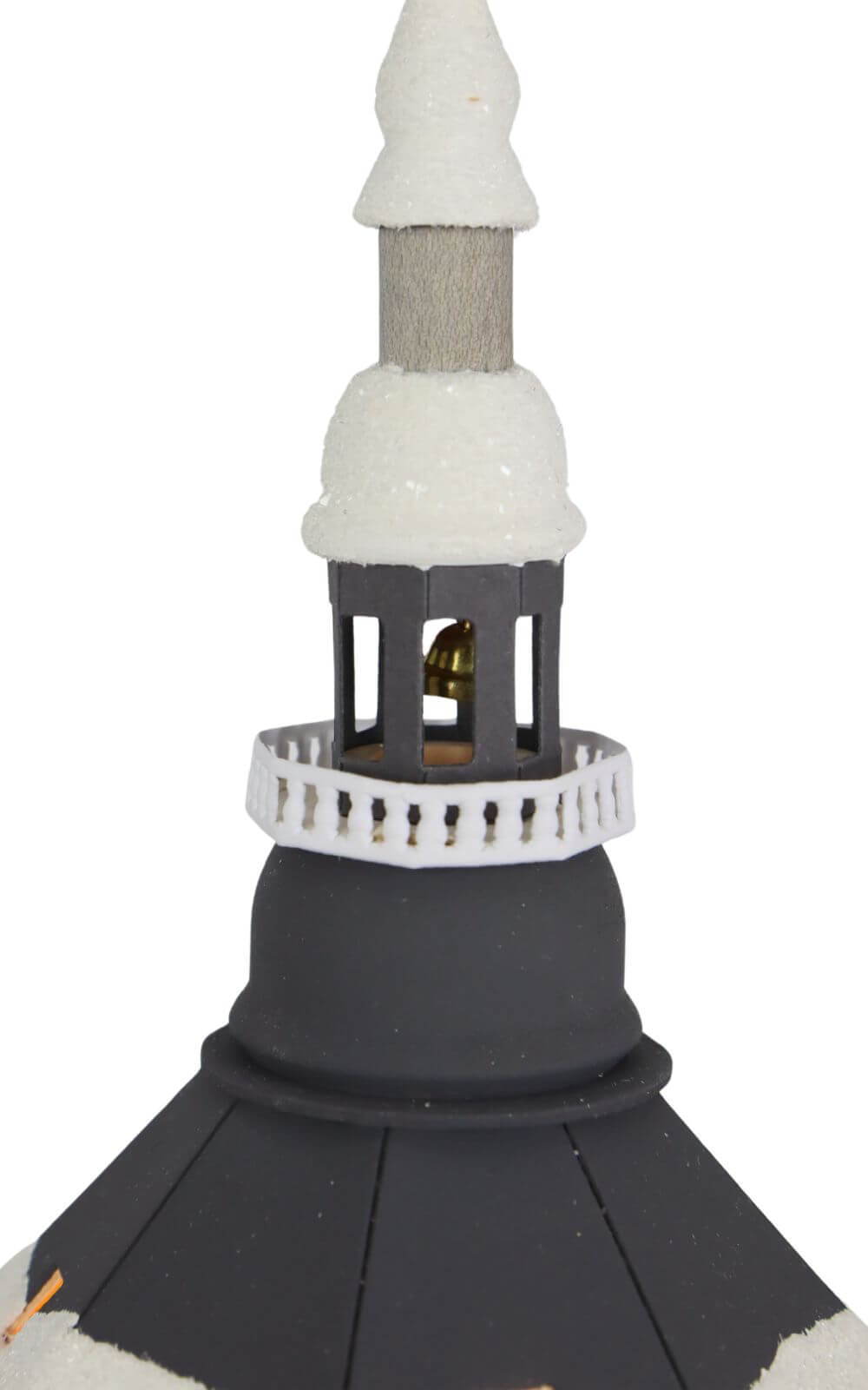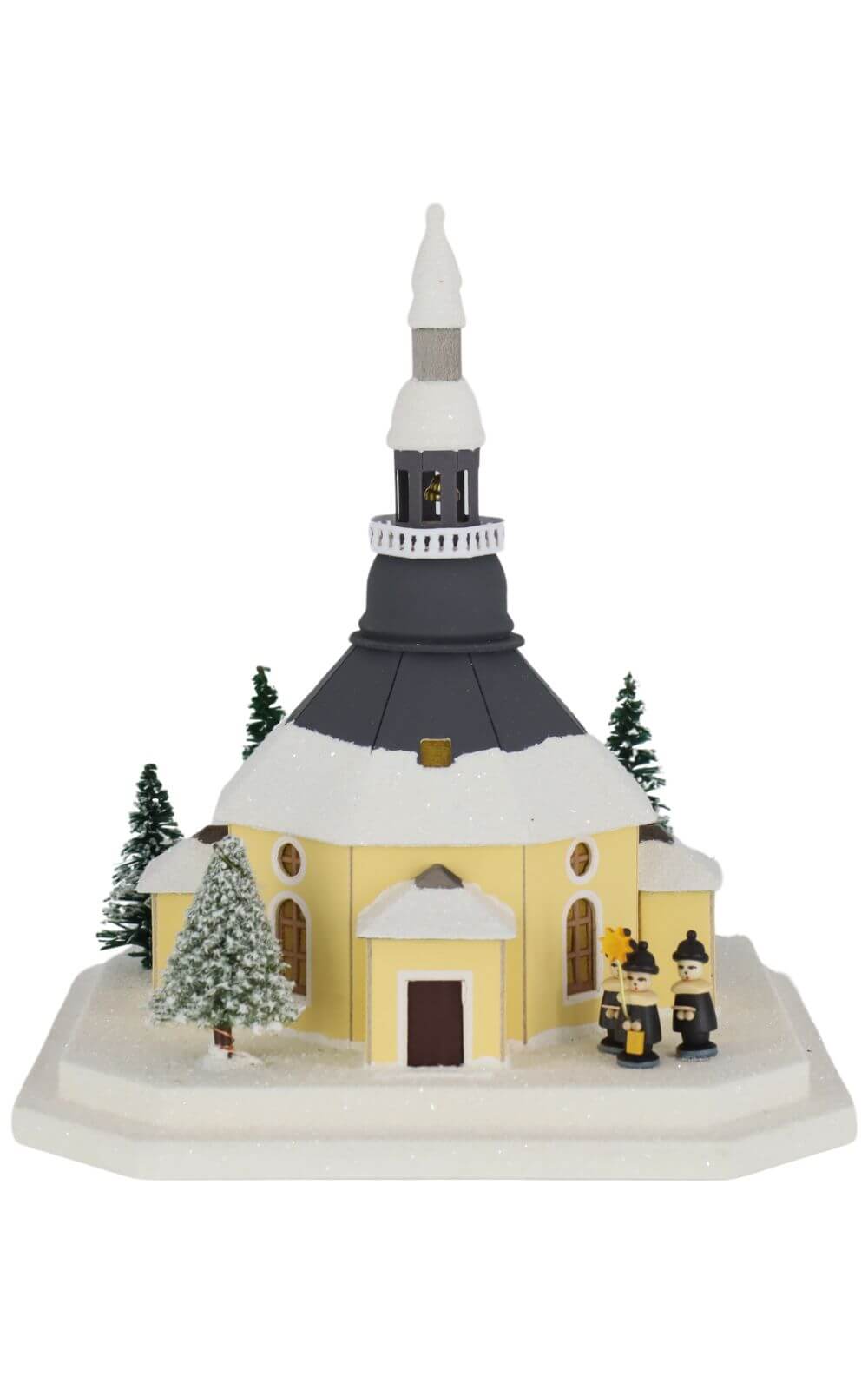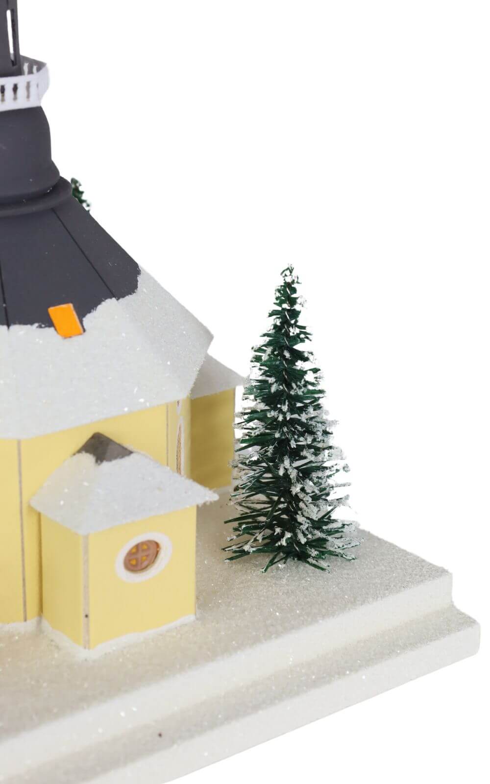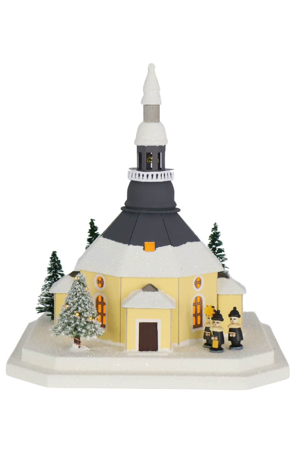 Das Lichterhaus stellt die Seiffener Kirche dar, in der heute der Weihnachtsgottesdienst stattfindet. Vor der Kirche steht ein mit einer Lichterkette geschmückter Weihnachtsbaum, umgeben von der Kurrende, die die Besucher des Gottesdienstes erwartet. Diese Szene ist mit viel Liebe zum Detail gestaltet und farbig bemalt. Das Lichterhaus besteht aus Feinkarton, während Fenster und Türen aus Pergamentpapier gefertigt sind, was eine warme und einladende Beleuchtung ermöglicht.