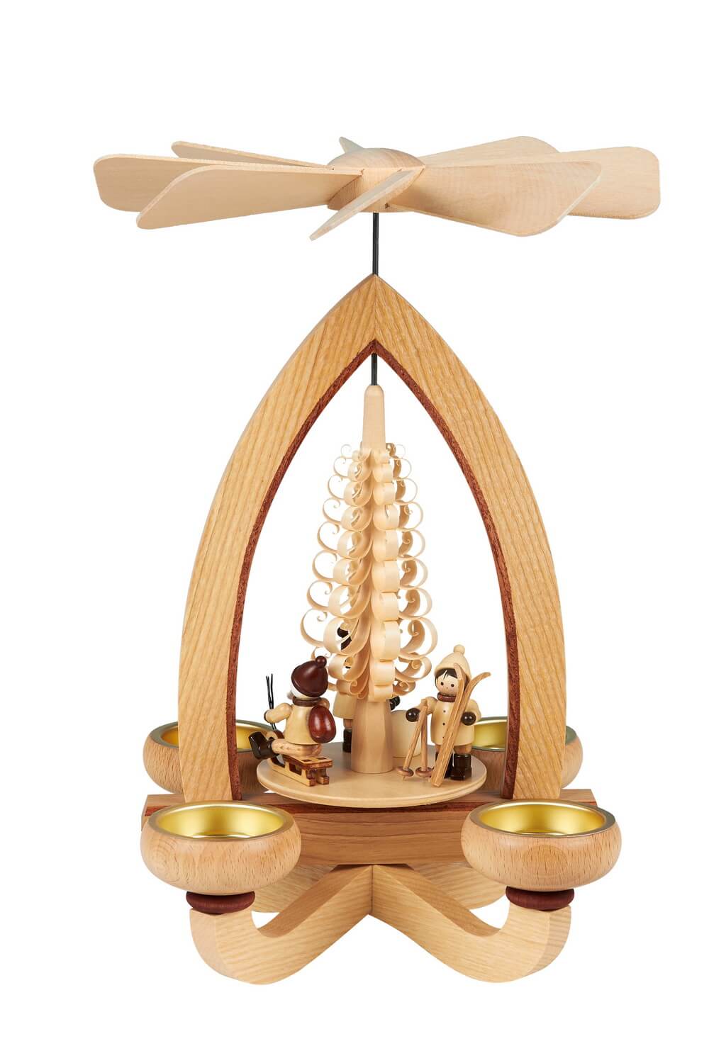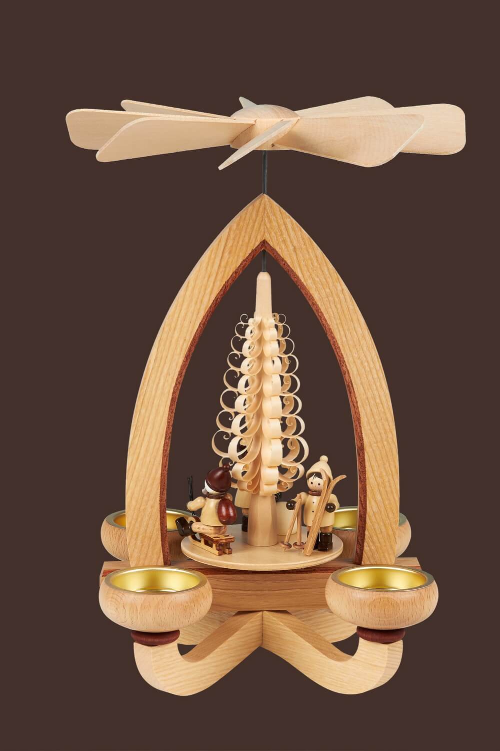 Weihnachtspyramide mit Weihnachtsmotiv für Teelichter, natur, 28 cm von Heinz Lorenz Olbernhau im Erzgebirge. Die Figuren sind 4,5 cm groß.