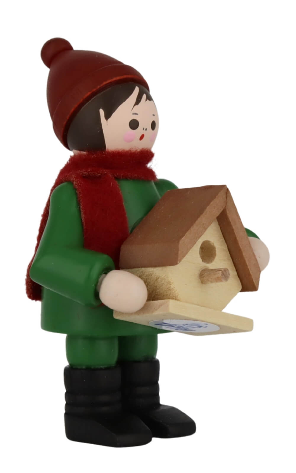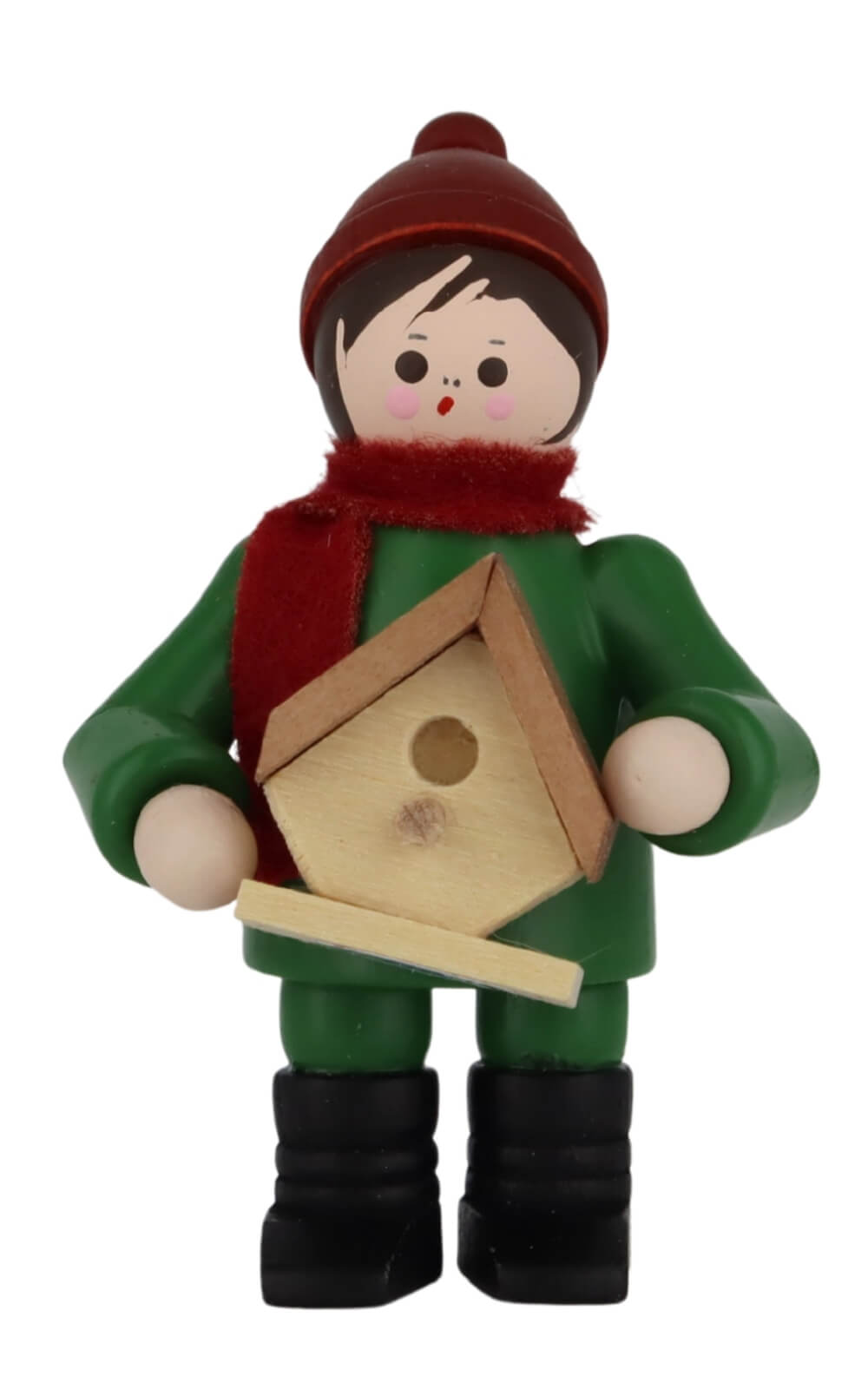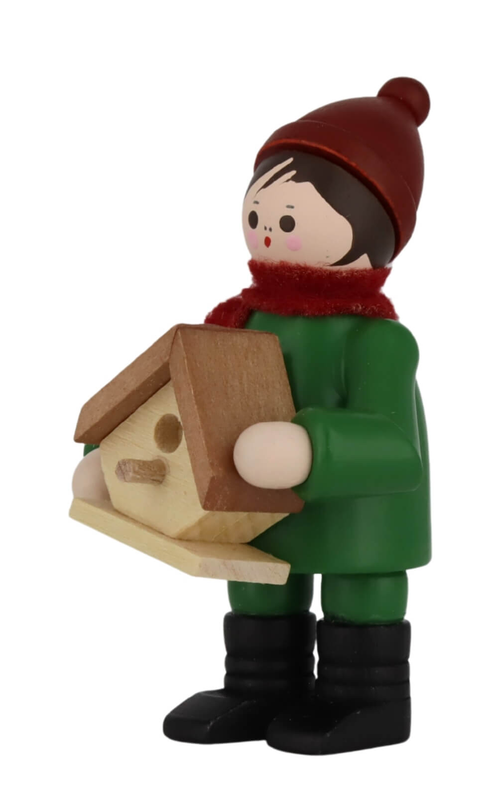 Mit roten Bäckchen, warmer Mütze und festem Griff hält der kleine Junge stolz sein selbstgebautes Vogelhäuschen in den Händen. Die Miniatur Junge mit Nistkasten, farbig, 6 cm von Romy Thiel begeistert mit liebevollen Details und einem klaren, kindlichen Ausdruck. In seinem waldgrünen Mantel und dem weinroten Schal wirkt die Figur wie aus einem winterlichen Spaziergang entsprungen. Das helle Holz des Nistkastens setzt einen natürlichen Akzent und harmoniert wunderbar mit den gedeckten Farben der Figur. Die schlichte, runde Formensprache und die fein abgestimmte Bemalung gibt ihr eine freundliche und warme Ausstrahlung.