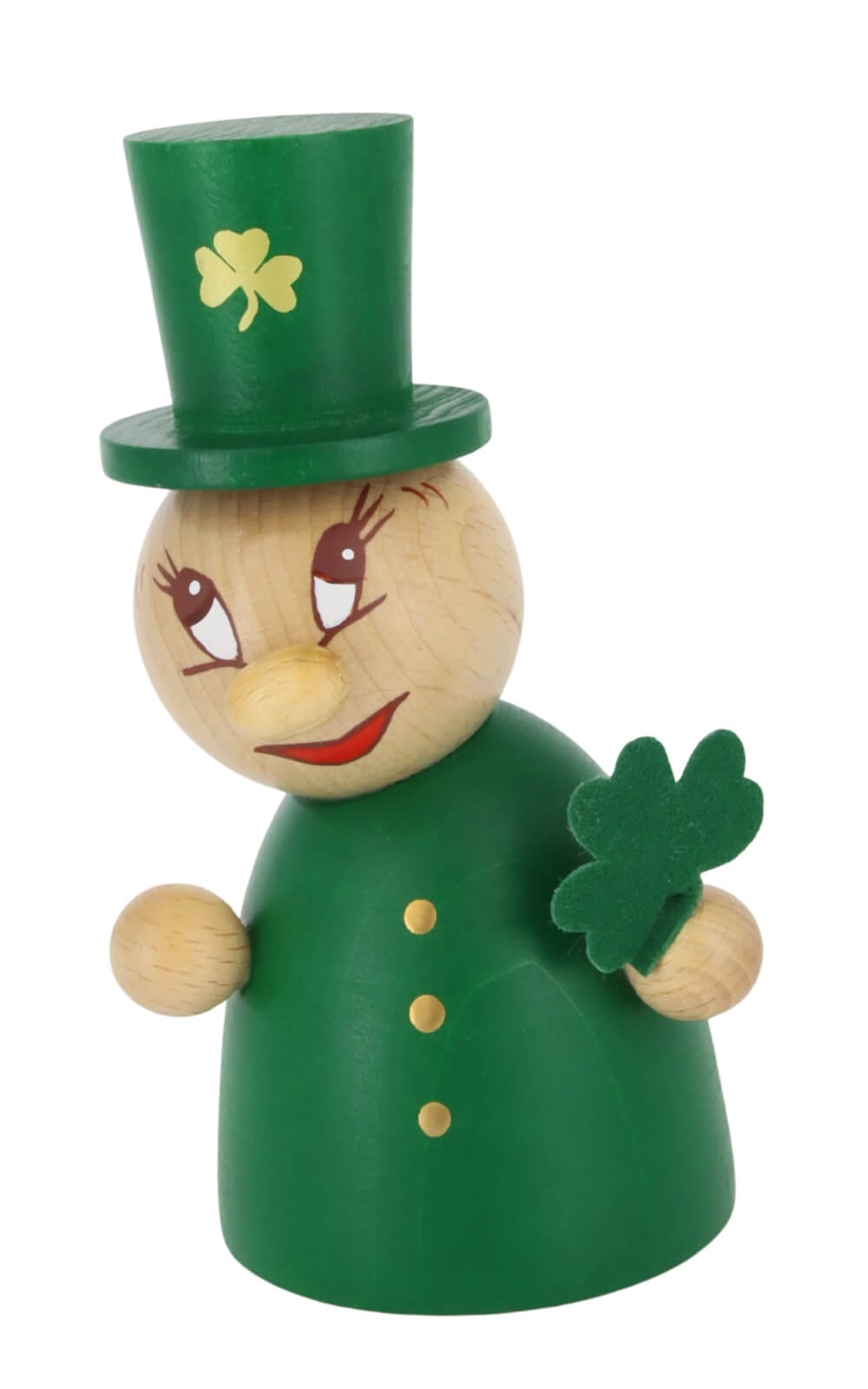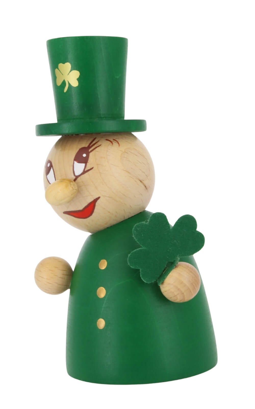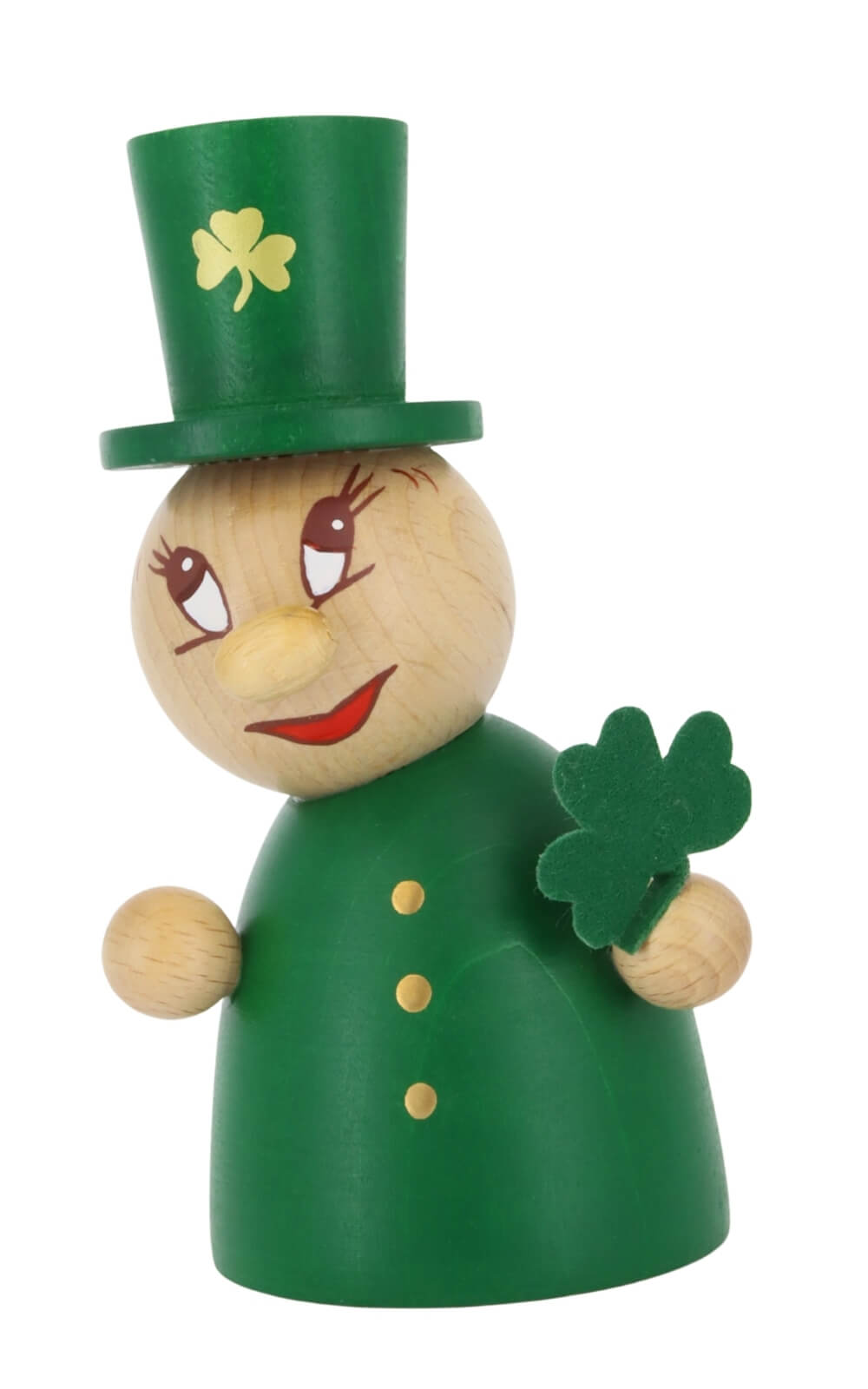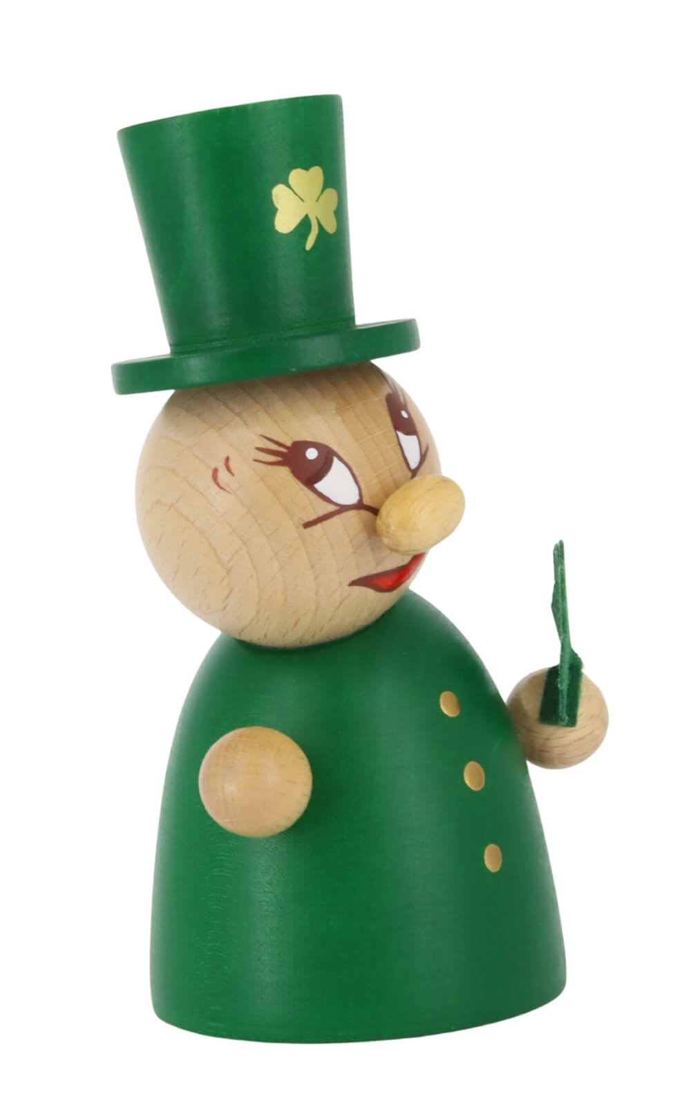 Die Miniatur St. Patrick's - Clumsy von Steinbach ist ein kleines Meisterstück voller Leben. Der kleine Ire trägt einen leuchtend grünen Zylinder mit goldener Schnalle und verströmt mit seinem freundlichen Gesicht pure Lebensfreude. Seine Wangen sind rosig, der kupferfarbene Bart sorgfältig bemalt, und seine Augen funkeln vor Schalk. In den Händen hält er ein vierblättriges Kleeblatt, Symbol für Glück, Hoffnung und Zuversicht. Sein Mantel leuchtet in sattem Grün und feine goldene Punkte symbolisieren die Knöpfe – charmant verrutscht, aber voller Charakter. Jedes Detail, von der Haltung bis zur Bemalung, zeigt die handwerkliche Sorgfalt, für die Steinbach Miniaturen bekannt sind.