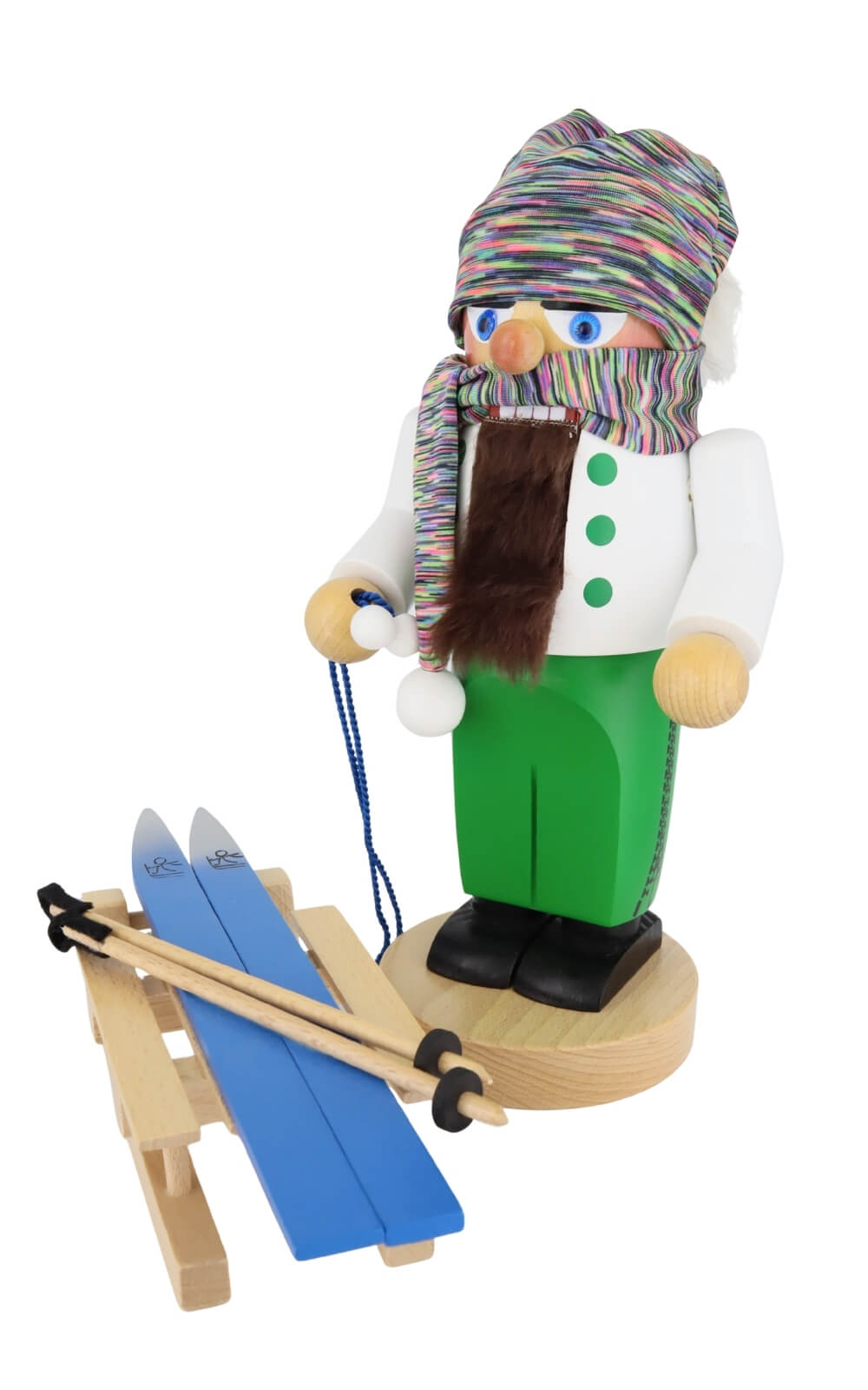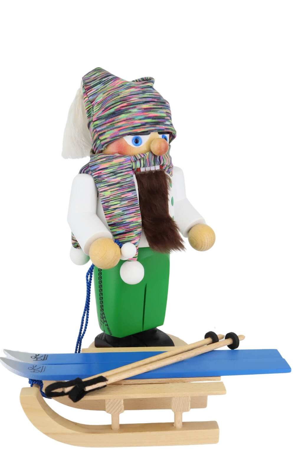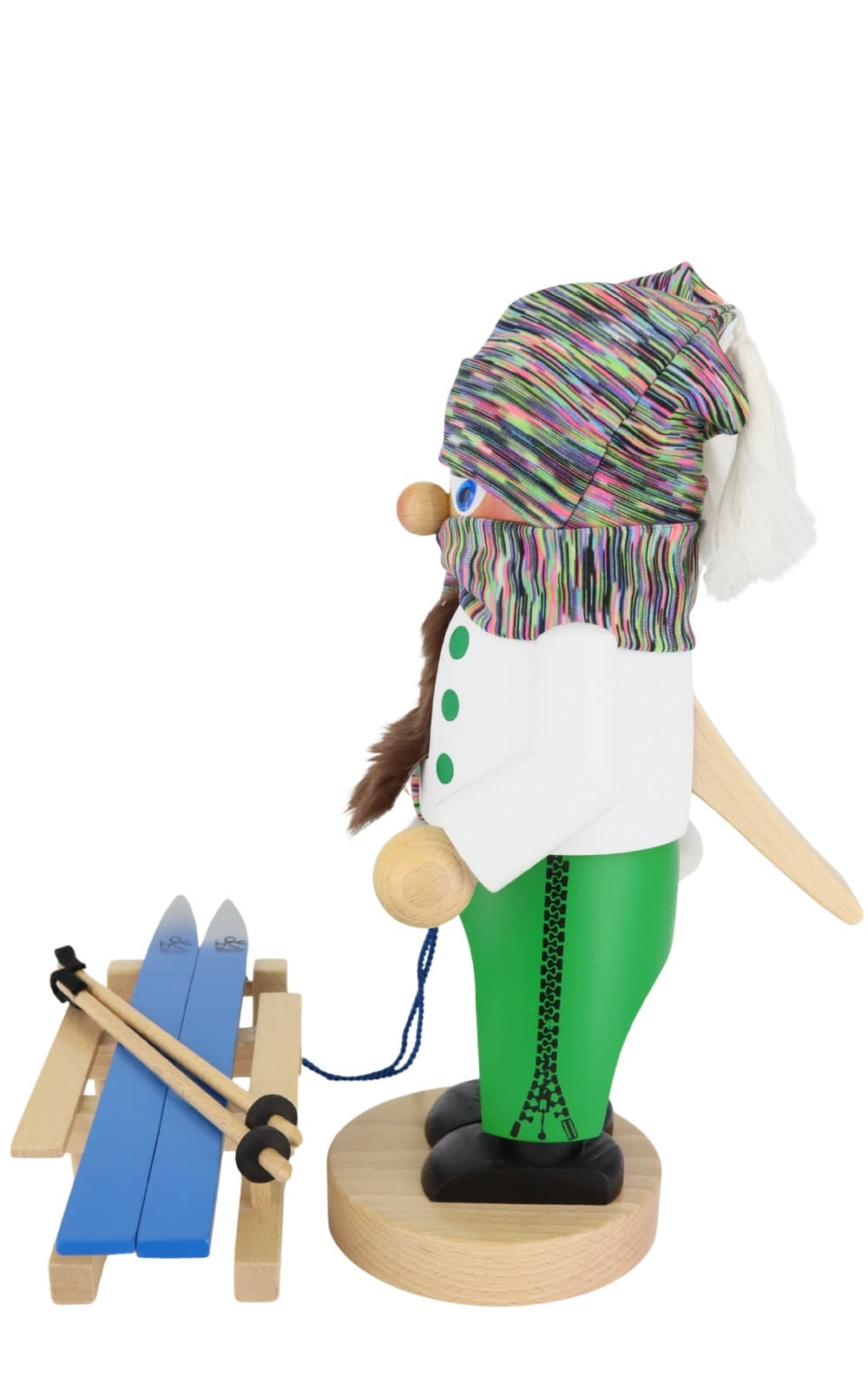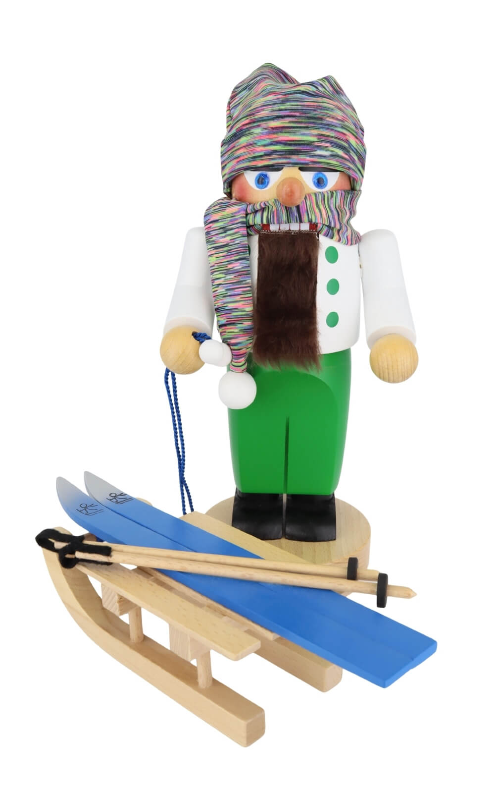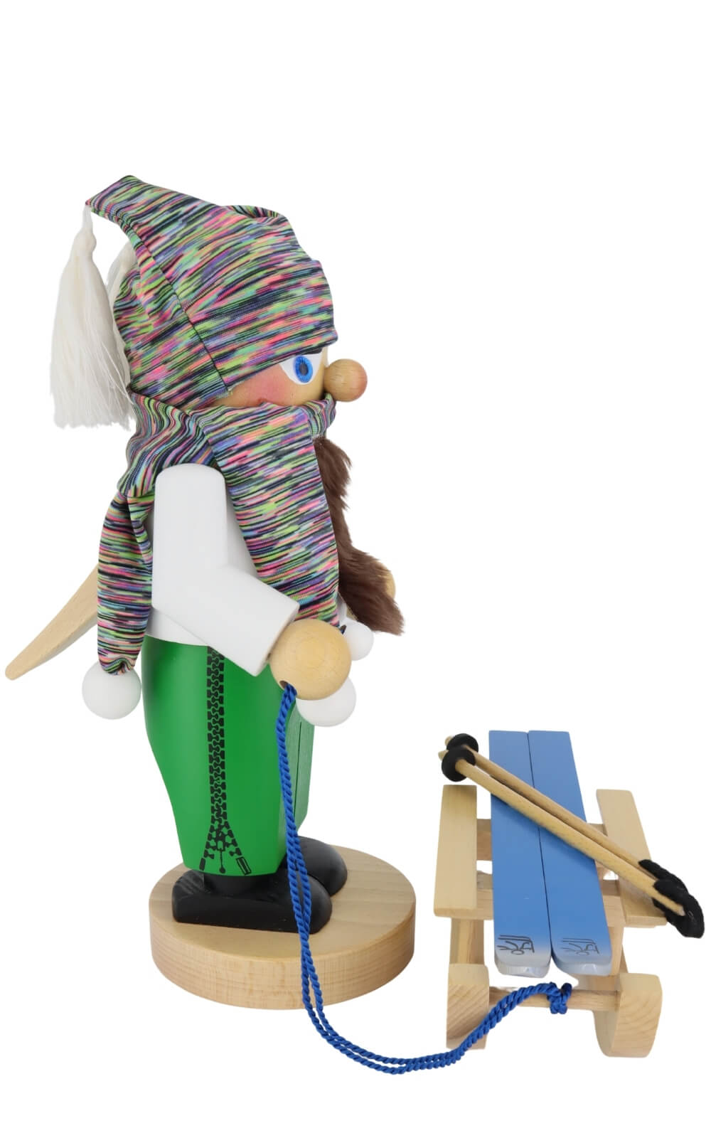 Die Figur des Skifahrers auf diesem außergewöhnlichen Nussknacker bringt einen Hauch von Wintersport und Alpenflair in Ihr Zuhause.  Farbenfroh und mit viel Liebe zum Detail gestaltet, ist der Nussknacker Skifahrer ein echter Blickfang. Wie es sich für einen Skifahrer gehört, ist die Figur mit warmer Mütze und Schal bekleidet. Diese Accessoires sind aufwendig gestrickt. Auf einem Schlitten transportiert der Wintersportler seine Ski und die Skistöcke zum Abfahrtshang.