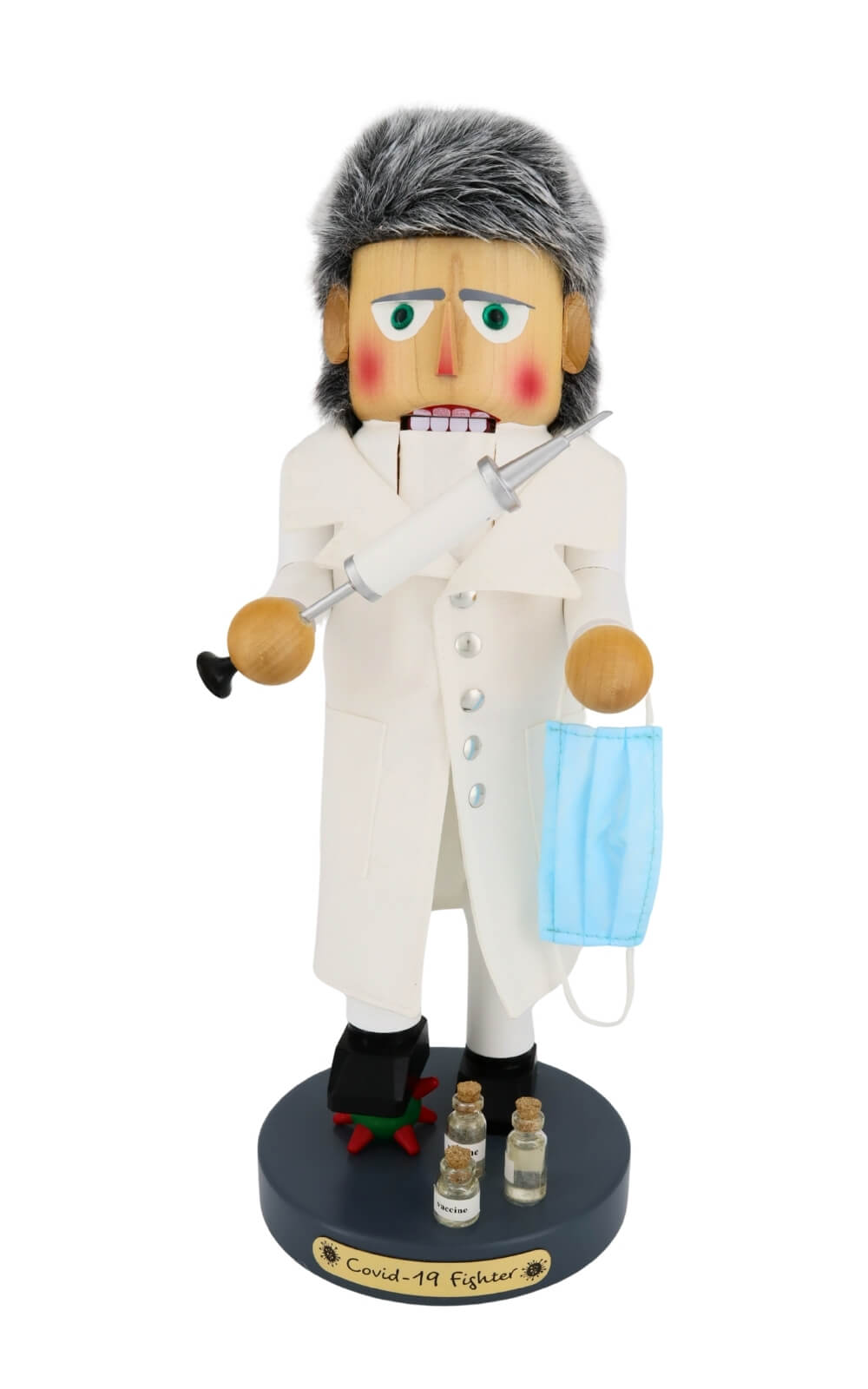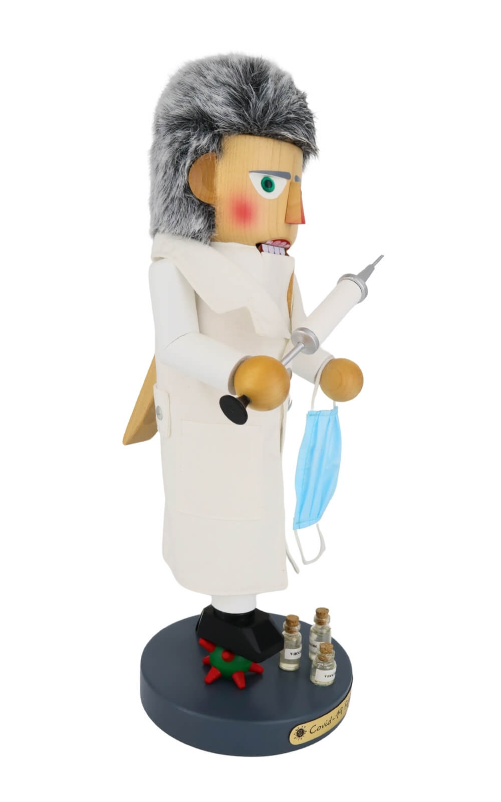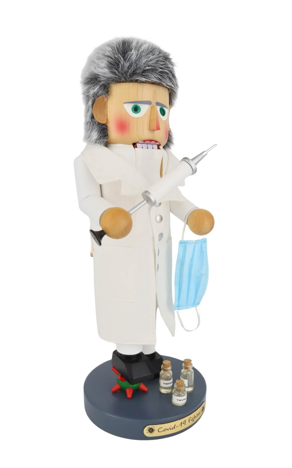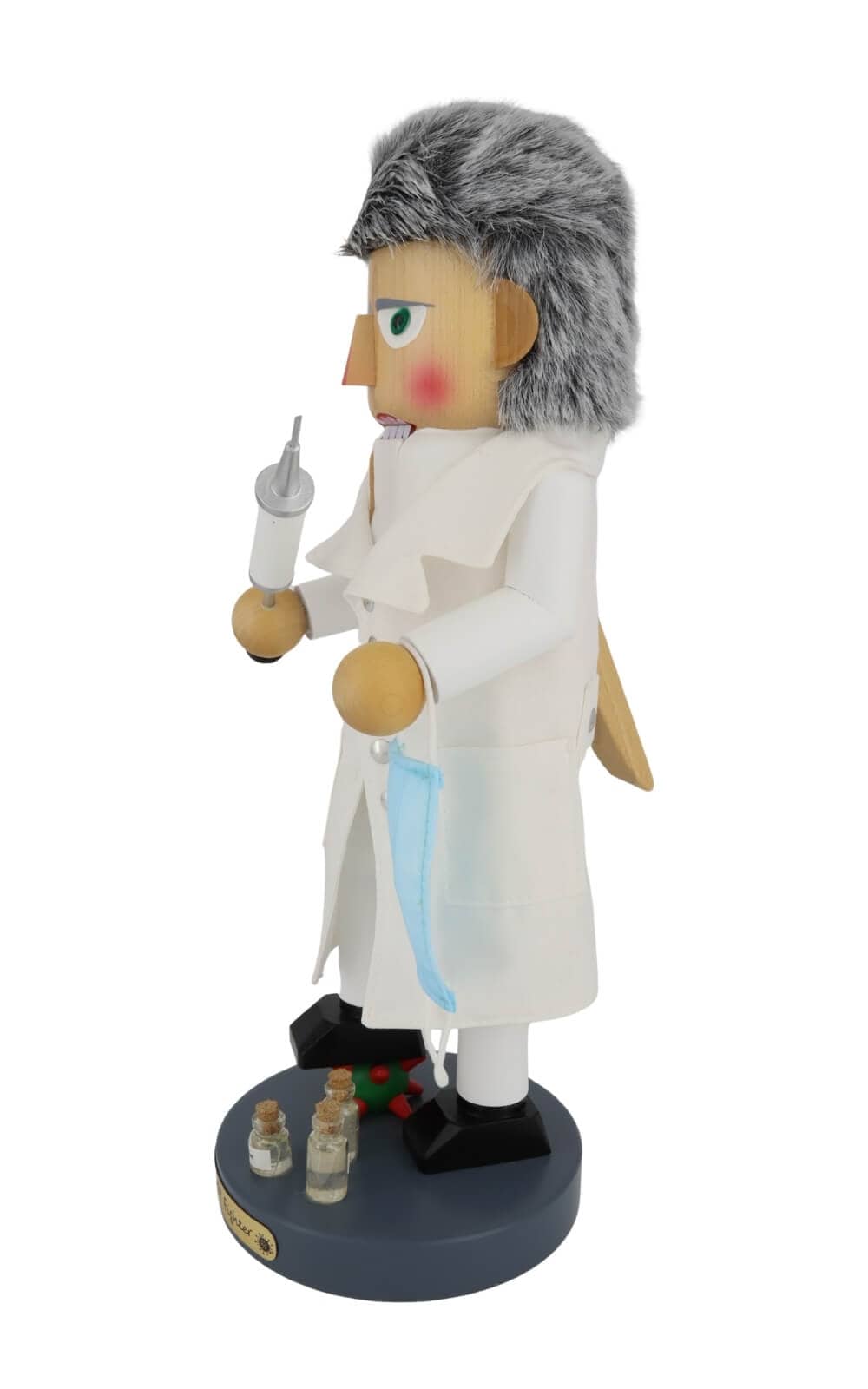 Der Nussknacker Arzt, 40 cm von Steinbach trägt seine Berufung förmlich zur Schau: In der rechten Hand hält er eine große Spritze, in der linken eine blaue Schutzmaske. Auf dem Sockel stehen kleine Impfstofffläschchen – ein liebevolles Detail, das seine Rolle als Virologe und Helfer unterstreicht. Die Nussknacker-Holzfigur trägt graues Haar und steht fest auf einem blauen Sockel. Besonders auffällig: Unter einem Schuh zertritt er symbolisch ein Virus-Modell – ein humorvoller, aber klarer Verweis auf seine Aufgabe, sich für die Gesundheit einzusetzen.