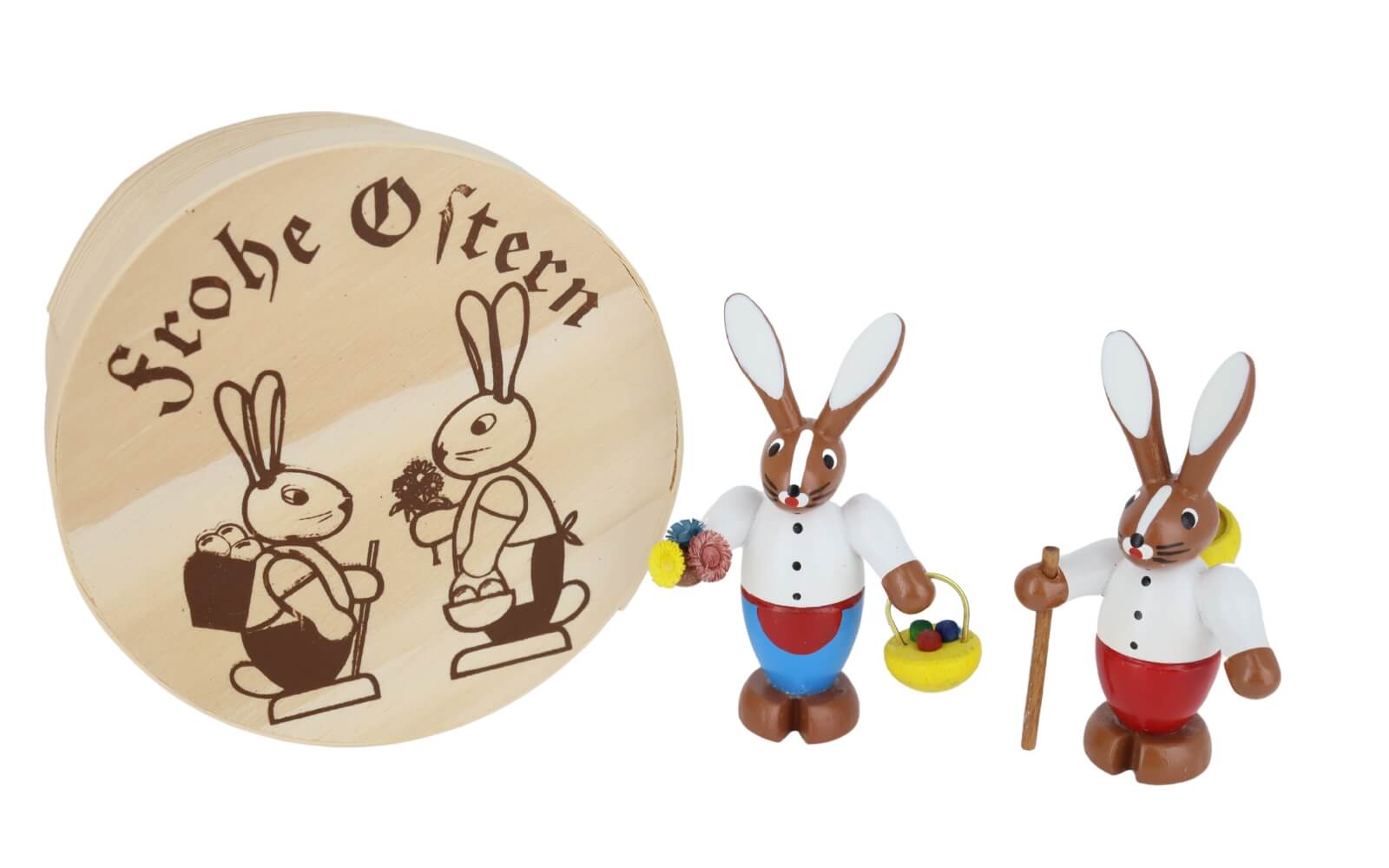 Im Zentrum dieses charmanten Sets stehen die beiden Osterhasen. Sie sind farbenfroh gestaltet und strahlen eine lustige und coole Atmosphäre aus. Ihr Design ist in einer Weise gestaltet, die sowohl Kinder als auch Erwachsene anspricht und Freude in jeden Raum bringt, in dem sie platziert werden. In einer Spanschachtel ist das Pärchen sicher in der Zeit nach Ostern verwahrt. Der Siebdruck auf der Schachtel lässt sofort den Inhalt erkennen. Hasenmann und Hasenfrau sind mit hochwertigen Farben und Lacken mit Hand gemalt.
