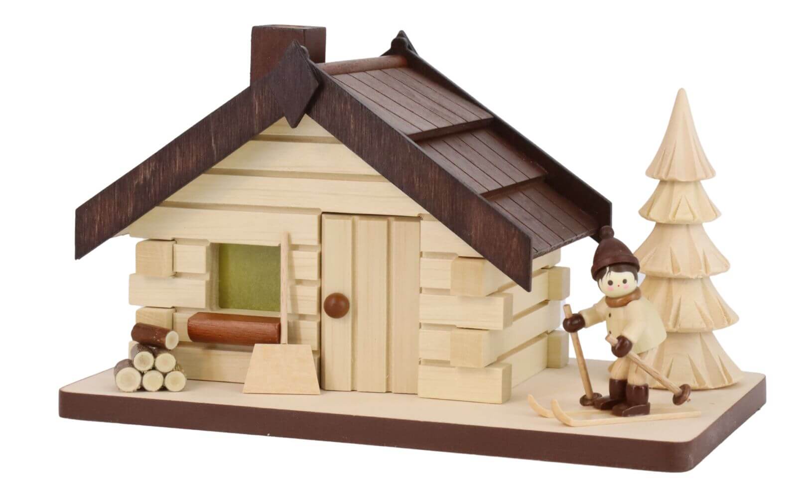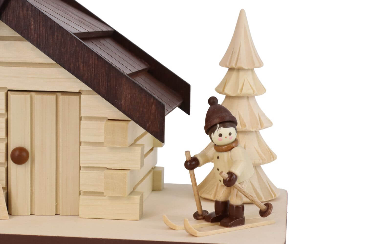 Wie von Romy Thiel Figuren gewöhnt, sind ihre Miniaturen filigran und natürlich gestaltet. So ist der Skifahrer entsprechend der kalten Jahreszeit bekleidet und das fein bemalte Gesicht wirkt sehr zart. Das Räucherhaus ist eine Blockhütte mit dunklem Dach, Fenstern und Tür. Vor dem Haus ist Rollenholz gestapelt, dass für wohlige Wärme drinnen sorgen soll. Eine große Schneekugel lädt zum Weiterbauen des Schneemanns ein. Neben der Hütte steht ein Tannenbaum, der kunstvoll gedrechselt ist.