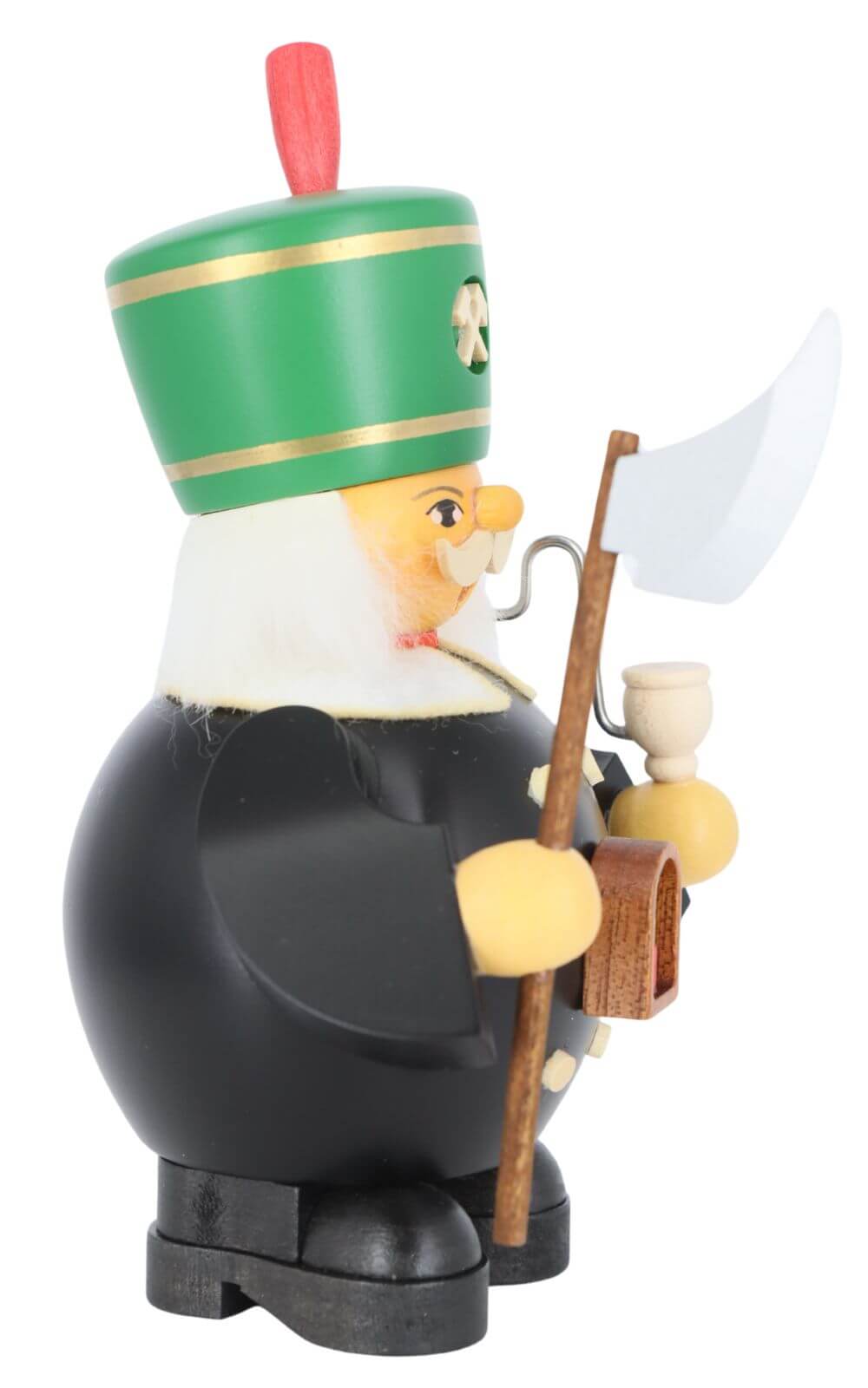 Dieses Räuchermännchen zeichnet sich durch sein traditionelles Design und seine farbenfrohen Details aus. Es wird aus verschiedenen heimischen Hölzern wie Ahorn, Buche, Erle, Esche, Fichte, Linde und Kiefer gefertigt. Diese Materialien verleihen der Figur Robustheit, Langlebigkeit und ein einzigartig warmes Aussehen, das den Charme handgefertigter Kunstwerke unterstreicht.