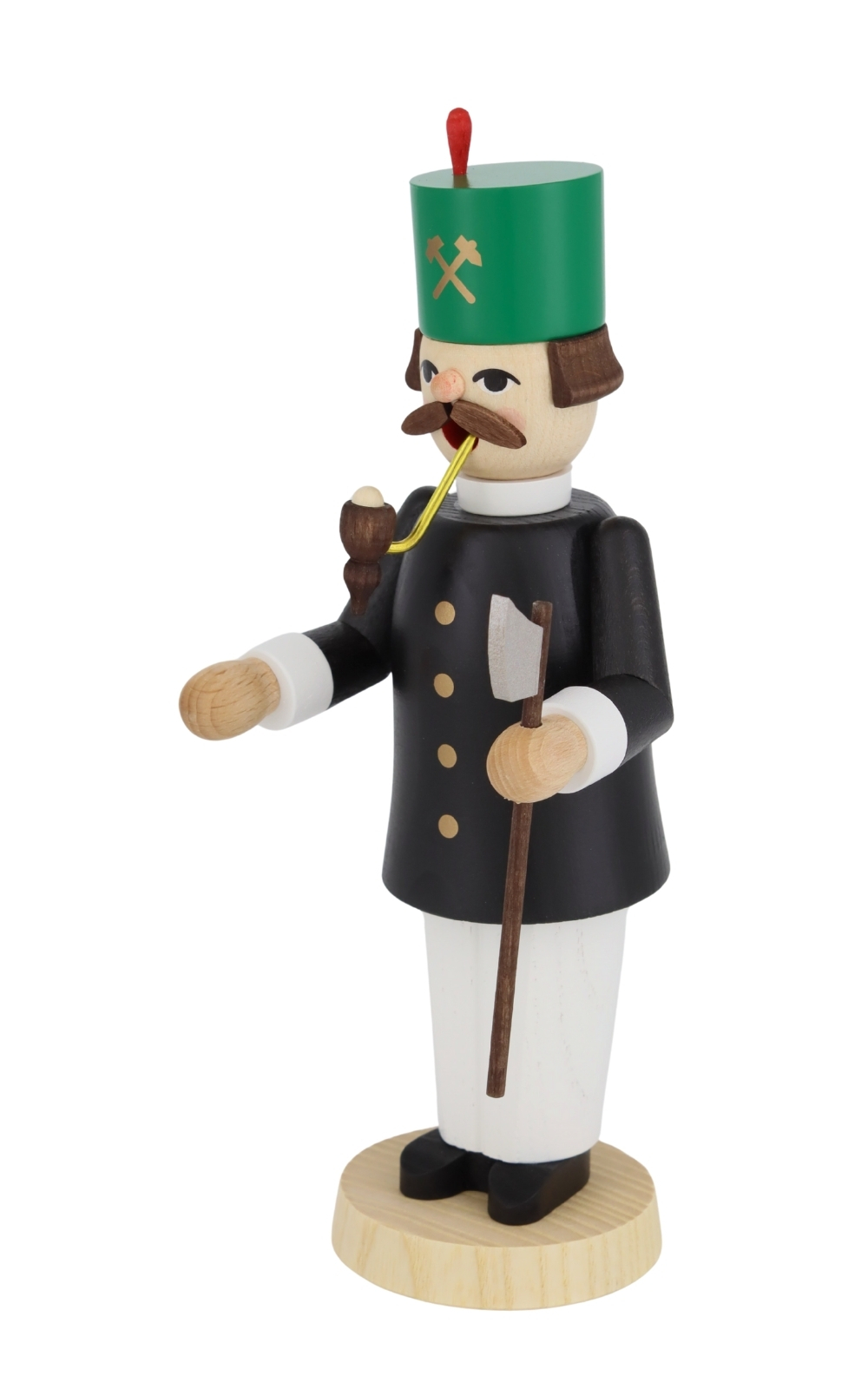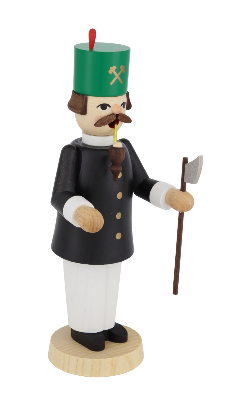 Das 21 cm hohe Räuchermännchen zeigt einen klassischen Bergmann in traditioneller Tracht: schwarze Jacke mit goldfarbenen Knöpfen, weiße Hose und schwarzes Schuhwerk. Auf dem Kopf trägt er den typischen grünen Zylinder mit rot betonter Feder und den gekreuzten Symbolen von Schlägel und Eisen – unverkennbare Zeichen des Bergbaus. In der linken Hand hält er eine silberne Axt, während aus dem Mund eine lange Pfeife ragt – bereit, den Rauch einer Standard-Räucherkerze in den Raum zu tragen.