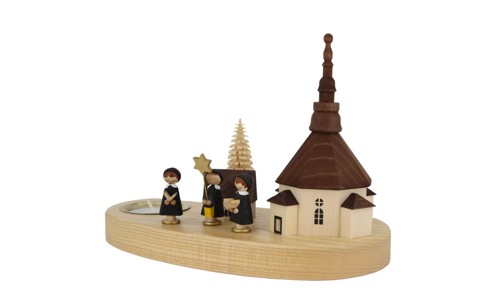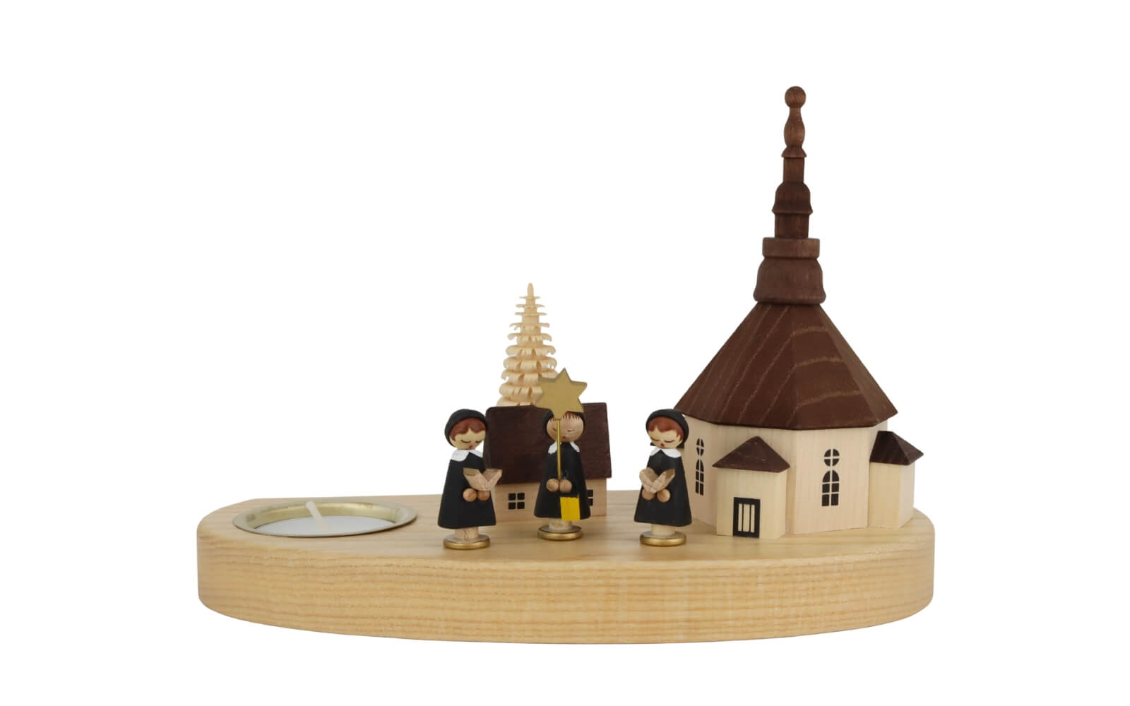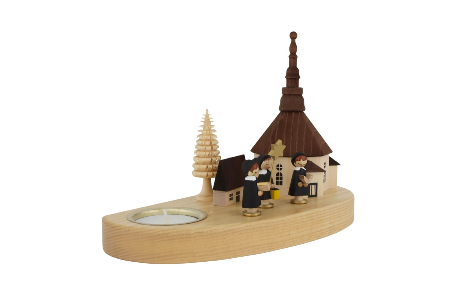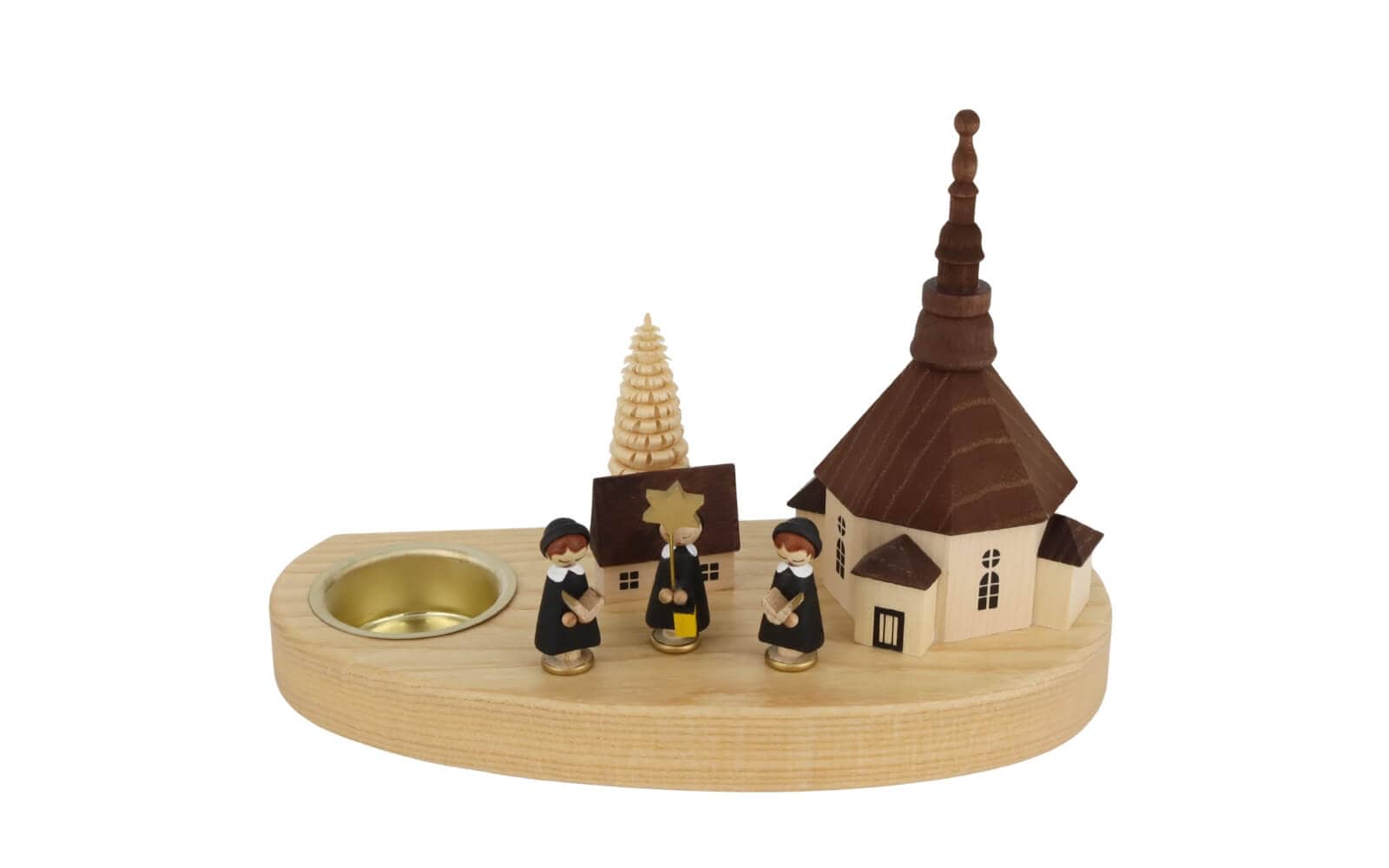 Kerzenhalter für Teelichte mit Seiffener Kirche und Kurrende, 16 cm, natur von Richard Glässer aus Seiffen im Erzgebirge
